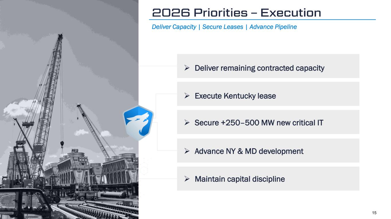 Geom Slide Title – 28 Franklin Gothic Med Header – 14 Franklin Gothic Book Content Text – 14 Franklin Gothic Book Chart Content – 10 RGB 33 – 40 – 64 20 – 135 – 211 129 – 200 – 255 205 – 217 – 225 74 – 88 – 135 Outline: black, ½ pt. 255 – 177 – 0 Financial Metric Q4 2025 Commentary Revenue $35.8M ➢ 29% QoQ decline driven by lower BTC price and higher network hash rate Gross HPC Lease Revenue $9.7M ➢ +35% QoQ from higher rent and pass-through revenue Adjusted EBITDA $(51.1)M ➢ Opex increased with HPC ramp ➢ SG&A increased with scaling workforce and milestone-based compensation Cash, Cash Equivalents, and Restricted Cash $3.7B ➢ Cash balance as of December 31, 2025 Net Debt1 $2.0B ➢ $2.5B Convertible Notes @ TeraWulf ➢ $3.2B Senior Secured Notes @ WULF Compute Q4 Financial Snapshot (1) Net debt is calculated as total debt of $5.7 billion (comprising $2.5 billion of Convertible Notes at TeraWulf and $3.2 billion of Senior Secured Notes at WULF Compute) less $3.7 billion of cash, cash equivalents, and restricted cash. 14