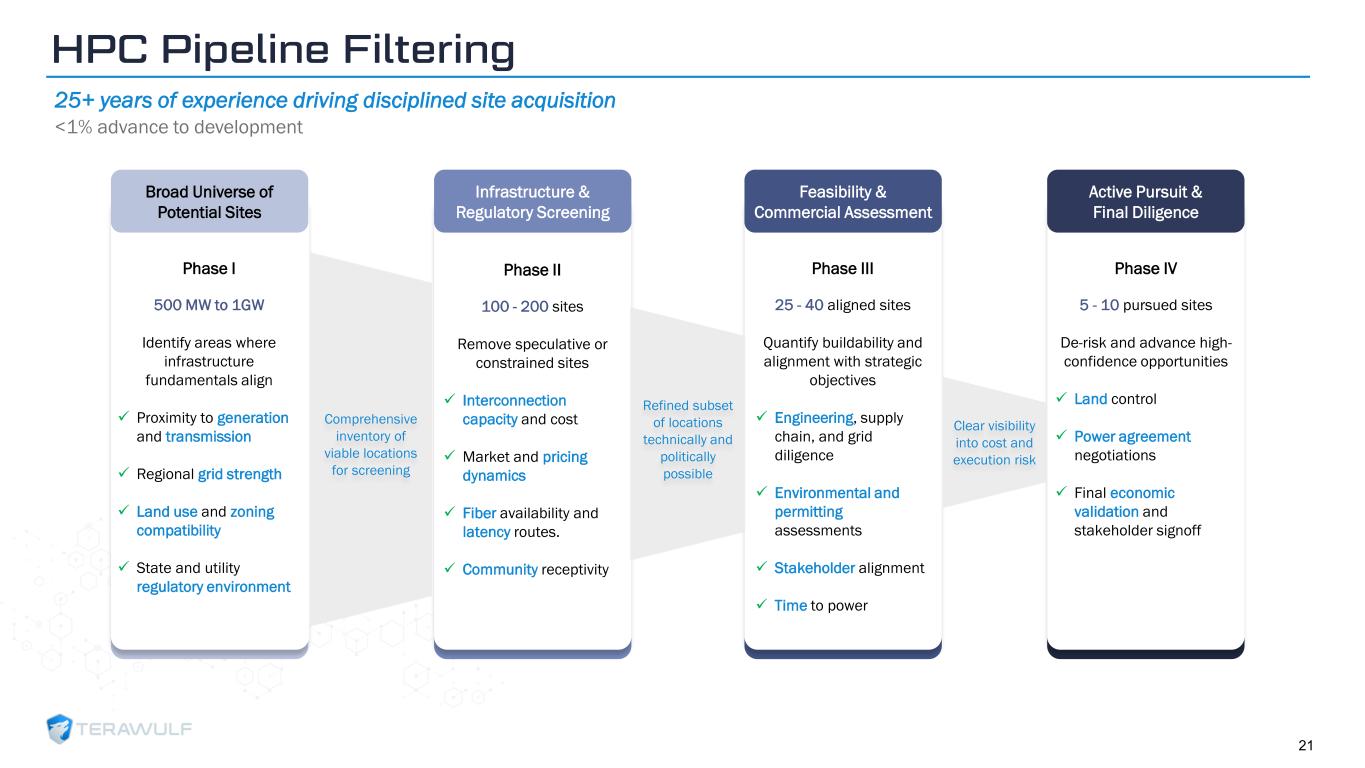 Geom Slide Title – 28 Franklin Gothic Med Header – 14 Franklin Gothic Book Content Text – 14 Franklin Gothic Book Chart Content – 10 RGB 33 – 40 – 64 20 – 135 – 211 129 – 200 – 255 205 – 217 – 225 74 – 88 – 135 Outline: black, ½ pt. 255 – 177 – 0 Capacity figures represent critical IT MWs. Future deployment figures assume an incremental 250-500 MW annually and are subject to customer demand and regulatory approvals for power draw beyond existing interconnection agreements. (1) Abernathy figures represent TeraWulf’s 50.1% joint venture interest. 1 11 60 60 60 60 60 378 378 378 378 378 84 84 84 84 84 250 500 750 1,000 1,250 250 500 750 1,000 1,250 2026 2027 2028 2029 2030 Core42 (LMD) Fluidstack (LMD) Fluidstack (Abernathy) (1) Development - Low End Development - High End 1.0 – 1.5 GW 1.3 – 2.0 GW 1.5 – 2.5 GW 0.8 - 1.0 GW 1.8 – 3.0 GW Leased Capacity + Pipeline Contracted Capacity 522 MW LMD Expansion 182 MW Lake Hawkeye 320 MW Justified Data 384 MW Chesapeake Data 800 MW Abernathy JV Options 168 MW 2.4 GW Multi -Year Development Runway Control of sufficient sites to deliver +250–500 MW annually through 2030