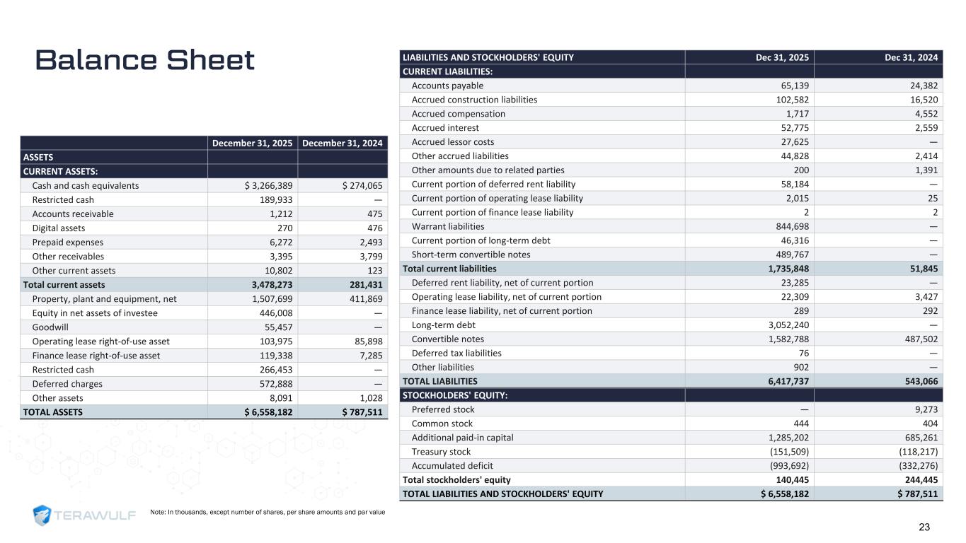 Geom Slide Title – 28 Franklin Gothic Med Header – 14 Franklin Gothic Book Content Text – 14 Franklin Gothic Book Chart Content – 10 RGB 33 – 40 – 64 20 – 135 – 211 129 – 200 – 255 205 – 217 – 225 74 – 88 – 135 Outline: black, ½ pt. 255 – 177 – 0 Note: In thousands, except number of shares, per share amounts and par value 23 Balance Sheet December 31, 2025 December 31, 2024 ASSETS CURRENT ASSETS: Cash and cash equivalents $ 3,266,389 $ 274,065 Restricted cash 189,933 — Accounts receivable 1,212 475 Digital assets 270 476 Prepaid expenses 6,272 2,493 Other receivables 3,395 3,799 Other current assets 10,802 123 Total current assets 3,478,273 281,431 Property, plant and equipment, net 1,507,699 411,869 Equity in net assets of investee 446,008 — Goodwill 55,457 — Operating lease right-of-use asset 103,975 85,898 Finance lease right-of-use asset 119,338 7,285 Restricted cash 266,453 — Deferred charges 572,888 — Other assets 8,091 1,028 TOTAL ASSETS $ 6,558,182 $ 787,511 LIABILITIES AND STOCKHOLDERS' EQUITY Dec 31, 2025 Dec 31, 2024 CURRENT LIABILITIES: Accounts payable 65,139 24,382 Accrued construction liabilities 102,582 16,520 Accrued compensation 1,717 4,552 Accrued interest 52,775 2,559 Accrued lessor costs 27,625 — Other accrued liabilities 44,828 2,414 Other amounts due to related parties 200 1,391 Current portion of deferred rent liability 58,184 — Current portion of operating lease liability 2,015 25 Current portion of finance lease liability 2 2 Warrant liabilities 844,698 — Current portion of long-term debt 46,316 — Short-term convertible notes 489,767 — Total current liabilities 1,735,848 51,845 Deferred rent liability, net of current portion 23,285 — Operating lease liability, net of current portion 22,309 3,427 Finance lease liability, net of current portion 289 292 Long-term debt 3,052,240 — Convertible notes 1,582,788 487,502 Deferred tax liabilities 76 — Other liabilities 902 — TOTAL LIABILITIES 6,417,737 543,066 STOCKHOLDERS' EQUITY: Preferred stock — 9,273 Common stock 444 404 Additional paid-in capital 1,285,202 685,261 Treasury stock (151,509) (118,217) Accumulated deficit (993,692) (332,276) Total stockholders' equity 140,445 244,445 TOTAL LIABILITIES AND STOCKHOLDERS' EQUITY $ 6,558,182 $ 787,511