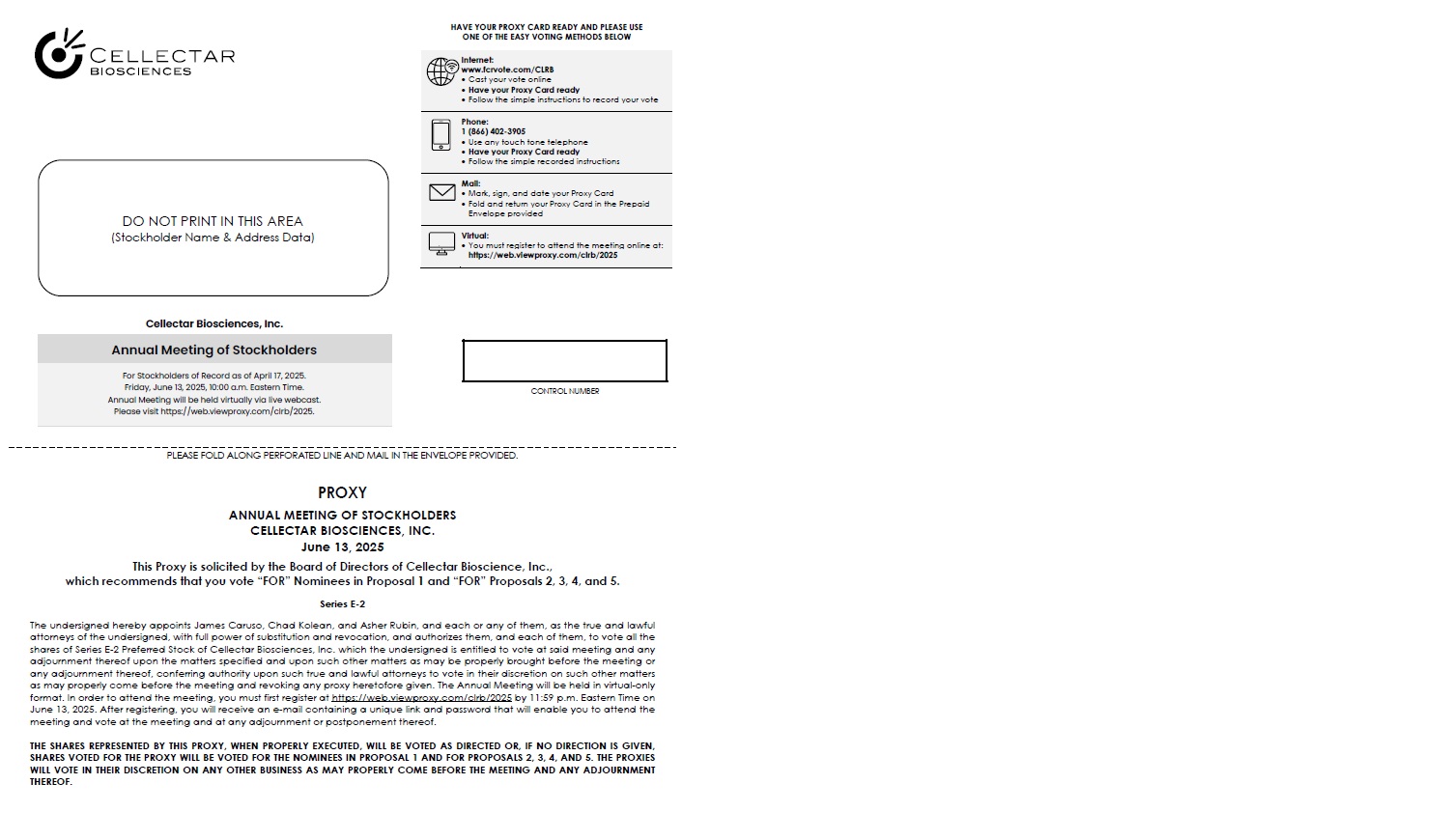 The 2025 Annual Meeting of Stockholders (the “Annual Meeting”) of Cellectar Biosciences, Inc. (the “Company”) will be held on Friday, June 13, 2025, at 10:00 A.M., local time, virtually over the internet. You will be able to attend the Annual Meeting, vote your shares electronically and submit your questions online by visiting https://web.viewproxy.com/clrb/2025 and entering the 11-digit control number included in the notice containing instructions on how to access Annual Meeting materials, your proxy card, or the voting instructions that accompanied the proxy materials. We will hold the Annual Meeting for the following purposes: