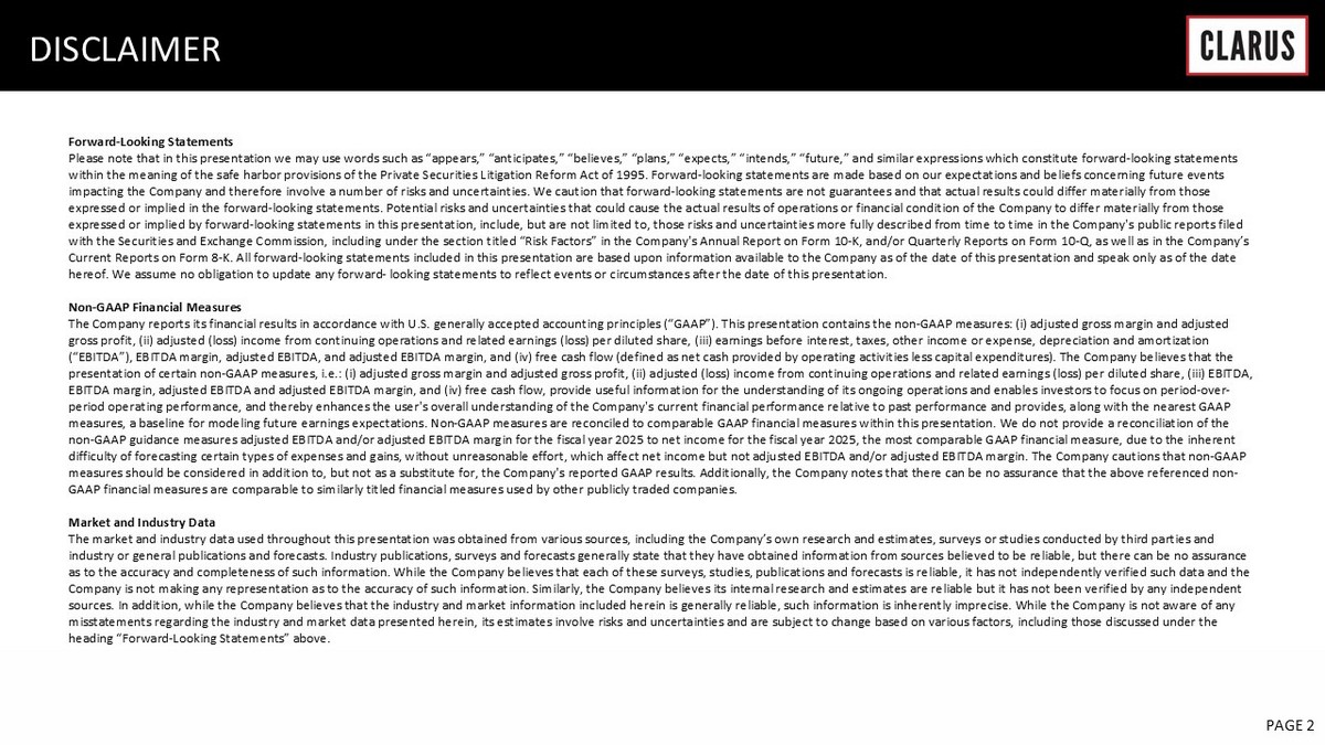 6 February 2023 PAGE 15 NON - GAAP RECONCILIATION (YTD) As reported $ 185,027 $ 64,840 $ 85,529 $ (3,877) (20.2) % $ (15,295) $ (0.40) Amortization of intangibles - - (6,586) 2,263 4,323 Impairment of indefinite-lived intangible assets - - (1,565) - 1,565 Disposal of internally developed software - - (365) 177 188 Restructuring charges - - (489) 186 303 Transaction costs - - (686) (1) 687 Contingent consideration benefit - - 355 - (355) Inventory fair value of purchase accounting - 120 - - 120 Other inventory reserves - 490 - - 490 Legal costs and regulatory matter expenses - - (3,463) (3) 3,466 Stock-based compensation - - (4,568) (1) 4,569 As adjusted $ 185,027 $ 65,450 $ 68,162 $ (1,256) 105.1 % $ 61 $ 0.00 As reported $ 192,910 $ 68,754 $ 89,023 $ (3,290) (17.9) % $ (15,112) $ (0.39) Amortization of intangibles - - (7,316) 1,511 5,805 Restructuring charges - - (1,009) 208 801 Transaction costs - - (168) 35 133 Contingent consideration benefit - - 125 (26) (99) PFAS inventory reserve - 3,323 - 687 2,636 Legal costs and regulatory matter expenses - - (3,795) 784 3,011 Stock-based compensation - - (4,253) 879 3,374 As adjusted $ 192,910 $ 72,077 $ 72,607 $ 788 58.9 % $ 549 $ 0.01 CLARUS CORPORATION RECONCILIATION FROM LOSS FROM CONTINUING OPERATIONS TO ADJUSTED INCOME FROM CONTINUING OPERATIONS AND RELATED EARNINGS PER DILUTED SHARE (In thousands, except per share amounts) Nine Months Ended September 30, 2025 Total Gross Operating Income tax Tax (Loss) income from Diluted sales profit expenses benefit rate continuing operations EPS (1) (1) Potentially dilutive securities are excluded from the computation of diluted earnings (loss) per share if their effect is anti-dilutive to the loss from continuing operations. Reported loss from continuing operations per share is calculated based on 38,390 basic and diluted weighted average shares of common stock. Adjusted income from continuing operations per share is calculated based on 38,440 diluted shares of common stock. Nine Months Ended September 30, 2024 Total Gross Operating Income tax continuing operations EPS (1) (1) Potentially dilutive securities are excluded from the computation of diluted earnings (loss) per share if their effect is anti-dilutive to the loss from continuing operations. Reported loss from continuing operations per share is calculated based on 38,286 basic and diluted weighted average shares of common stock. Adjusted income from continuing operations per share is calculated based on 38,426 diluted shares of common stock. Tax (Loss) income from Diluted sales profit expenses (benefit) expense rate