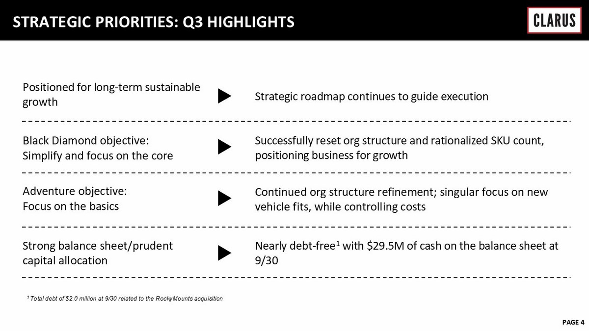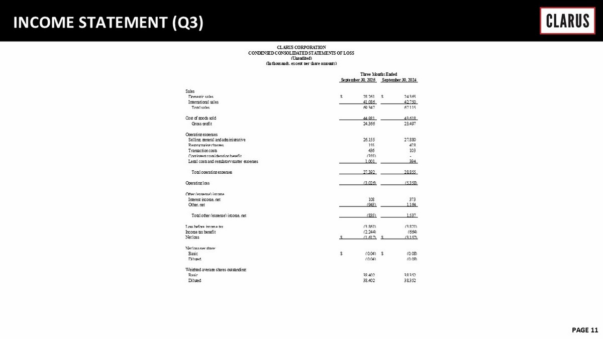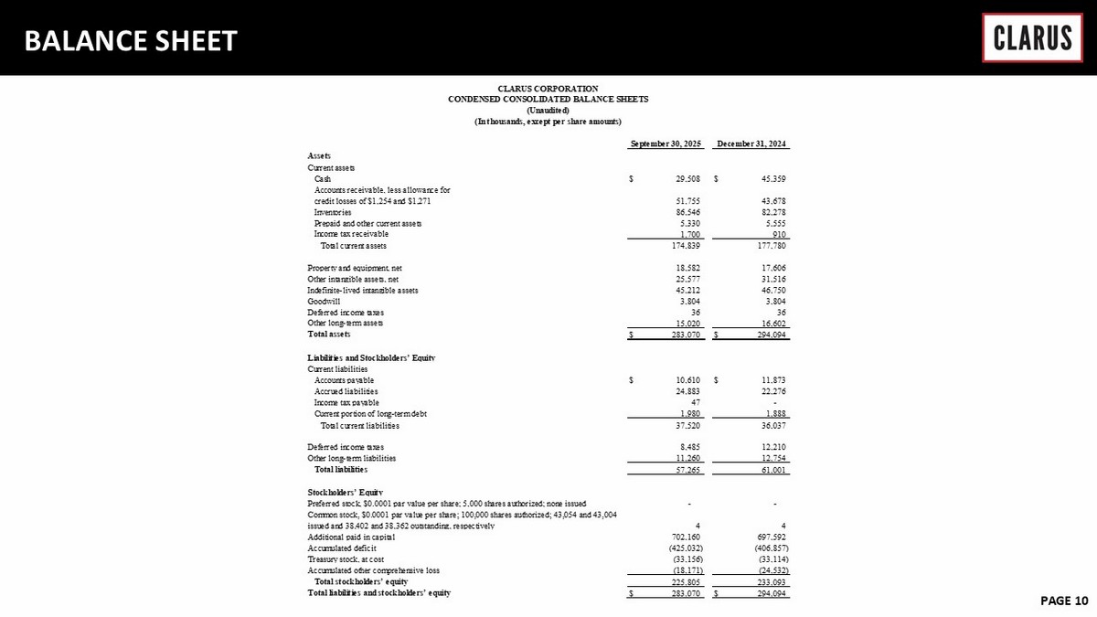 6 February 2023 PAGE 10 BALANCE SHEET Assets Current assets Cash $ 29,508 $ 45,359 Accounts receivable, less allowance for credit losses of $1,254 and $1,271 51,755 43,678 Inventories 86,546 82,278 Prepaid and other current assets 5,330 5,555 Income tax receivable 1,700 910 Total current assets 174,839 177,780 Property and equipment, net 18,582 17,606 Other intangible assets, net 25,577 31,516 Indefinite-lived intangible assets 45,212 46,750 Goodwill 3,804 3,804 Deferred income taxes 36 36 Other long-term assets 15,020 16,602 Total assets $ 283,070 $ 294,094 Liabilities and Stockholders’ Equity Current liabilities Accounts payable $ 10,610 $ 11,873 Accrued liabilities 24,883 22,276 Income tax payable 47 - Current portion of long-term debt 1,980 1,888 Total current liabilities 37,520 36,037 Deferred income taxes 8,485 12,210 Other long-term liabilities 11,260 12,754 Total liabilities 57,265 61,001 Stockholders’ Equity Preferred stock, $0.0001 par value per share; 5,000 shares authorized; none issued - - Common stock, $0.0001 par value per share; 100,000 shares authorized; 43,054 and 43,004 issued and 38,402 and 38,362 outstanding, respectively 4 4 Additional paid in capital 702,160 697,592 Accumulated deficit (425,032) (406,857) Treasury stock, at cost (33,156) (33,114) Accumulated other comprehensive loss (18,171) (24,532) Total stockholders’ equity 225,805 233,093 Total liabilities and stockholders’ equity $ 283,070 $ 294,094 September 30, 2025 December 31, 2024 CLARUS CORPORATION CONDENSED CONSOLIDATED BALANCE SHEETS (Unaudited) (In thousands, except per share amounts)