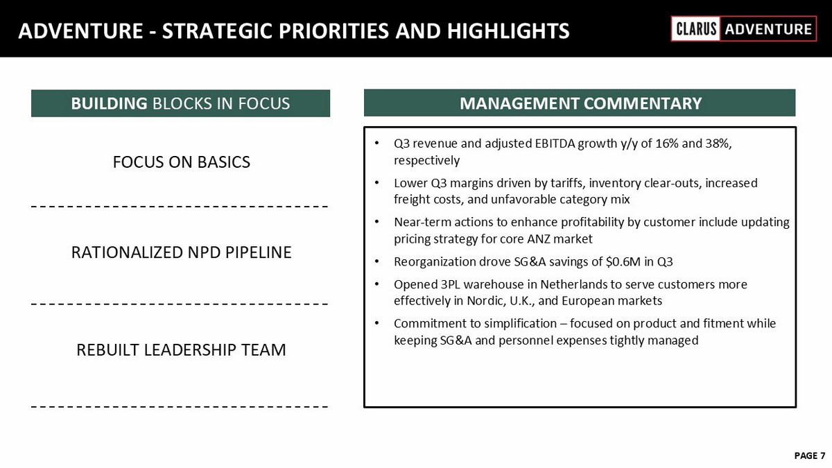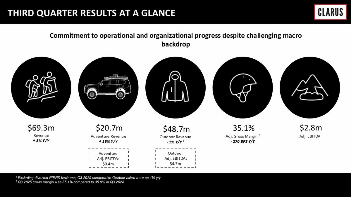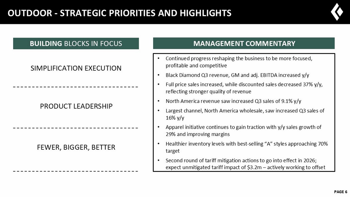 Commitment to operational and organizational progress despite challenging macro backdrop $ 69.3m $20.7 m $48.7 m 35.1 % $2.8 m Revenue + 3% Y/Y Adventure Revenue + 16% Y/Y Outdoor Revenue - 1% Y/Y 1 Adj. Gross Margin 2 - 270 BPS Y/Y Adj. EBITDA THIRD QUARTER RESULTS AT A GLANCE Adventure Adj. EBITDA: $0.4m Outdoor Adj. EBITDA: $4.7m 1 Excluding divested PIEPS business, Q3 2025 comparable Outdoor sales were up 1% y/y 2 Q3 2025 gross margin was 35.1% compared to 35.0% in Q3 2024