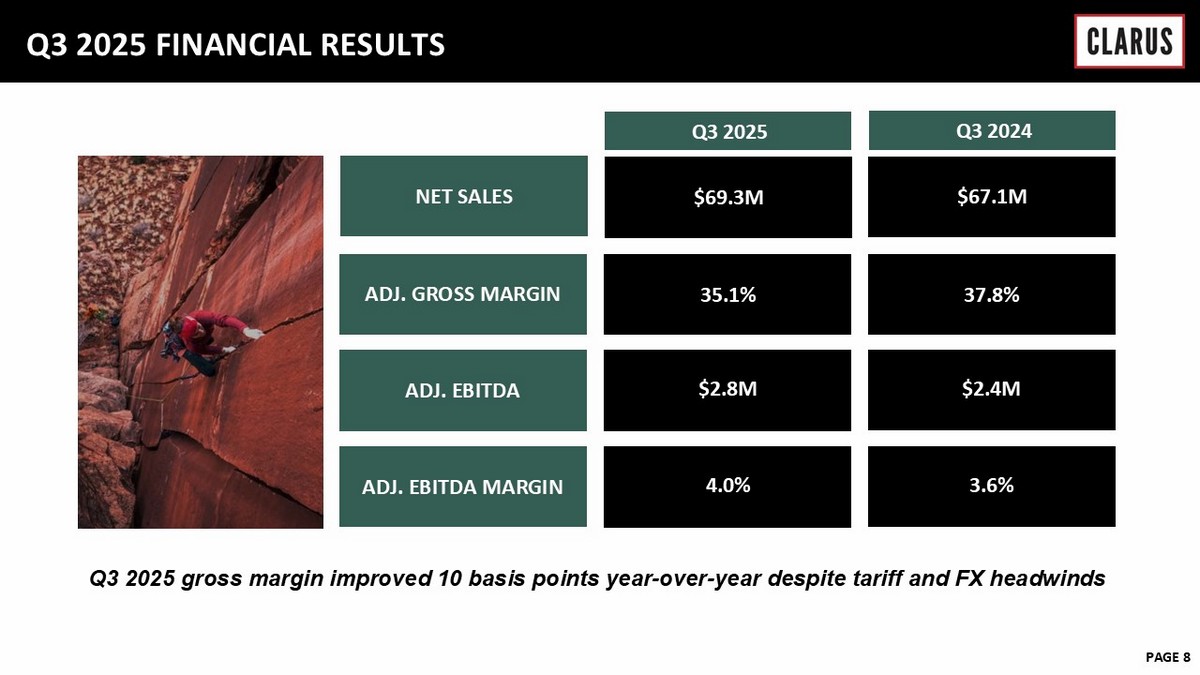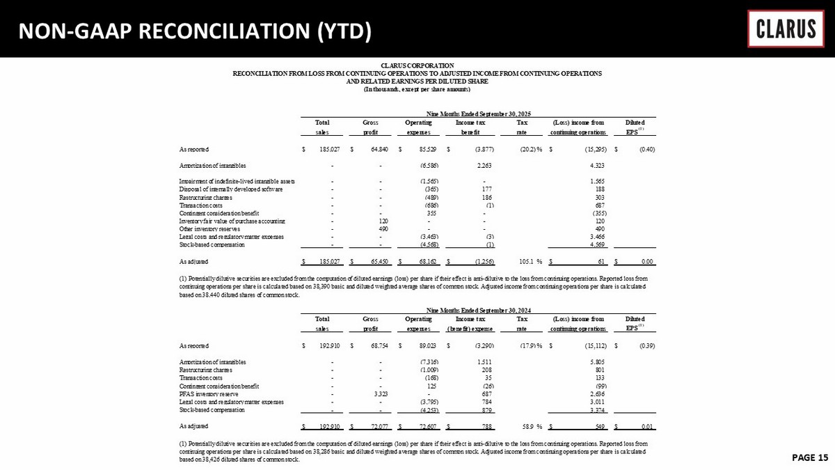 6 February 2023 PAGE 14 NON - GAAP RECONCILIATION (Q3) As reported $ 69,347 $ 24,366 $ 27,392 $ (2,244) (58.1) % $ (1,617) $ (0.04) Amortization of intangibles - - (2,149) 1,751 398 Disposal of internally developed software - - - 129 (129) Restructuring charges - - (155) 147 8 Transaction costs - - (436) (30) 466 Contingent consideration benefit - - 355 - (355) Inventory fair value of purchase accounting - - - (16) 16 Other inventory reserves - - - (57) 57 Legal costs and regulatory matter expenses - - (1,001) (287) 1,288 Stock-based compensation - - (1,545) (106) 1,651 As adjusted $ 69,347 $ 24,366 $ 22,461 $ (712) (66.5) % $ 1,782 $ 0.05 As reported $ 67,115 $ 23,497 $ 28,855 $ (664) (17.4) % $ (3,157) $ (0.08) Amortization of intangibles - - (2,416) 629 1,787 Restructuring charges - - (478) 112 366 Transaction costs - - (103) 23 80 Contingent consideration benefit - - - 12 (12) PFAS and other inventory reserves - 1,878 - 427 1,451 Legal costs and regulatory matter expenses - - (394) 171 223 Stock-based compensation - - (1,547) 392 1,155 As adjusted $ 67,115 $ 25,375 $ 23,917 $ 1,102 36.8 % $ 1,893 $ 0.05 CLARUS CORPORATION RECONCILIATION FROM NET LOSS TO ADJUSTED NET INCOME AND RELATED EARNINGS PER DILUTED SHARE (In thousands, except per share amounts) Three Months Ended September 30, 2025 Total Gross Operating Income tax Tax Net Diluted sales profit expenses benefit rate (loss) income EPS (1) (1) Potentially dilutive securities are excluded from the computation of diluted earnings (loss) per share if their effect is anti-dilutive to net loss. Reported net loss per share is calculated based on 38,402 basic and diluted weighted average shares of common stock. Adjusted net income per share is calculated based on 38,452 diluted shares of common stock. Three Months Ended September 30, 2024 Total Gross Operating Income tax (loss) income EPS (1) (1) Potentially dilutive securities are excluded from the computation of diluted earnings (loss) per share if their effect is anti-dilutive to net loss. Reported net loss per share is calculated based on 38,352 basic and diluted weighted average shares of common stock. Adjusted net income per share is calculated based on 38,455 diluted shares of common stock. Tax Net Diluted sales profit expenses (benefit) expense rate