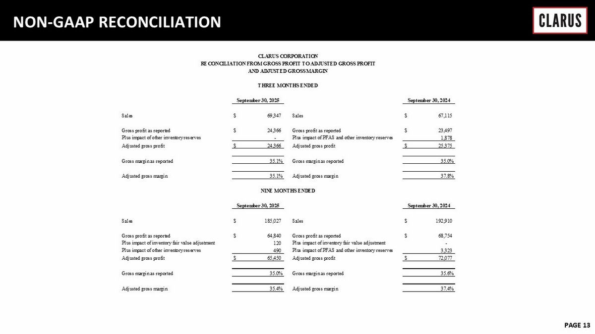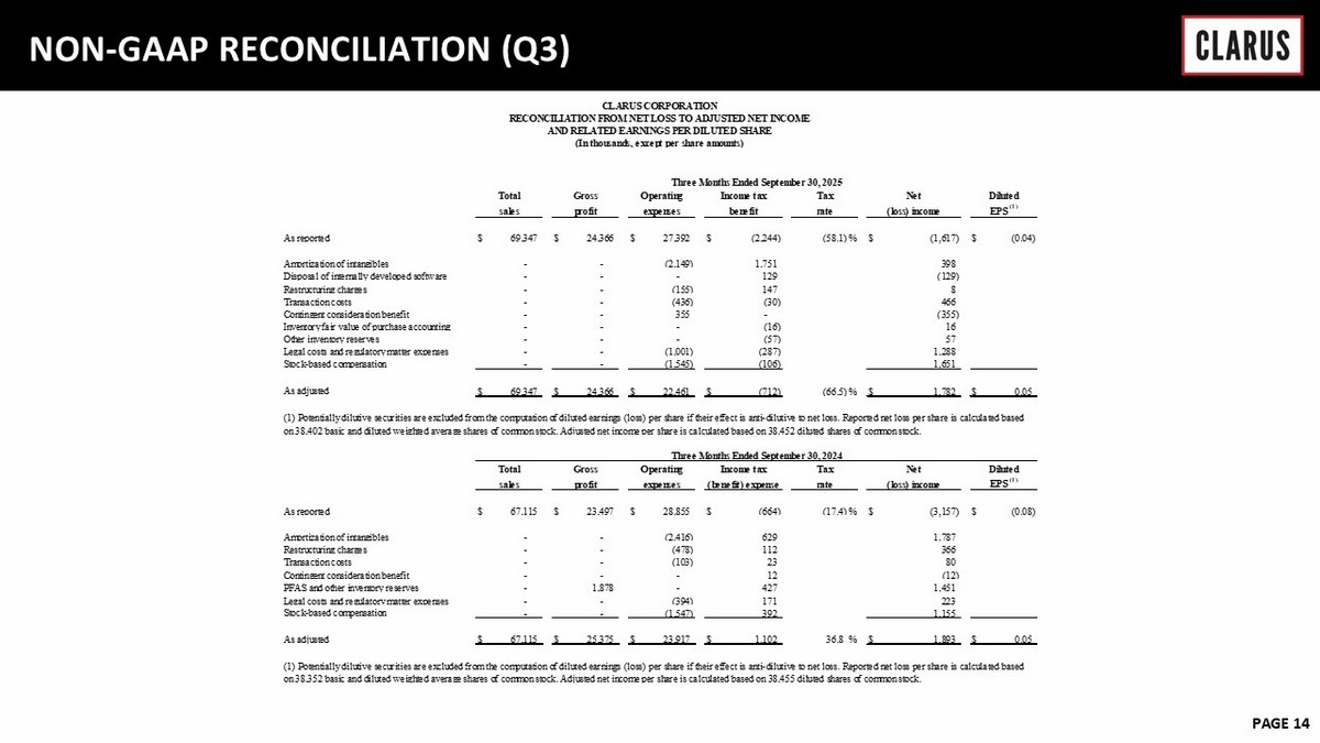 6 February 2023 PAGE 13 NON - GAAP RECONCILIATION Sales $ 69,347 Sales $ 67,115 Gross profit as reported $ 24,366 Gross profit as reported $ 23,497 Plus impact of other inventory reserves - Plus impact of PFAS and other inventory reserves 1,878 Adjusted gross profit $ 24,366 Adjusted gross profit $ 25,375 Gross margin as reported 35.1% Gross margin as reported 35.0% Adjusted gross margin 35.1% Adjusted gross margin 37.8% Sales $ 185,027 Sales $ 192,910 Gross profit as reported $ 64,840 Gross profit as reported $ 68,754 Plus impact of inventory fair value adjustment 120 Plus impact of inventory fair value adjustment - Plus impact of other inventory reserves 490 Plus impact of PFAS and other inventory reserves 3,323 Adjusted gross profit $ 65,450 Adjusted gross profit $ 72,077 Gross margin as reported 35.0% Gross margin as reported 35.6% Adjusted gross margin 35.4% Adjusted gross margin 37.4% NINE MONTHS ENDED September 30, 2025 September 30, 2024 CLARUS CORPORATION RECONCILIATION FROM GROSS PROFIT TO ADJUSTED GROSS PROFIT AND ADJUSTED GROSS MARGIN THREE MONTHS ENDED September 30, 2025 September 30, 2024