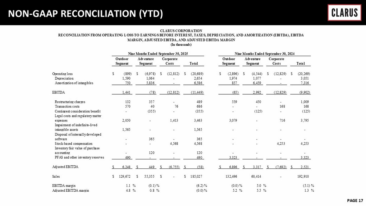 6 February 2023 PAGE 16 NON - GAAP RECONCILIATION (Q3) Operating income (loss) $ 3,221 $ (1,721) $ (4,526) $ (3,026) $ 1,210 $ (2,507) $ (4,061) $ (5,358) Depreciation 550 344 - 894 640 340 - 980 Amortization of intangibles 222 1,927 - 2,149 286 2,130 - 2,416 EBITDA 3,993 550 (4,526) 17 2,136 (37) (4,061) (1,962) Restructuring charges 1 154 - 155 189 289 - 478 Transaction costs 414 - 22 436 - - 103 103 Contingent consideration benefit - (355) - (355) - - - - Legal costs and regulatory matter expenses 322 - 679 1,001 194 - 200 394 Stock-based compensation - - 1,545 1,545 - - 1,547 1,547 PFAS and other inventory reserves - - - - 1,878 - - 1,878 Adjusted EBITDA $ 4,730 $ 349 $ (2,280) $ 2,799 $ 4,397 $ 252 $ (2,211) $ 2,438 Sales $ 48,688 $ 20,659 $ - $ 69,347 49,287 17,828 - 67,115 EBITDA margin 8.2 % 2.7 % 0.0 % 4.3 % (0.2) % (2.9) % Adjusted EBITDA margin 9.7 % 1.7 % 4.0 % 8.9 % 1.4 % 3.6 % CLARUS CORPORATION RECONCILIATION FROM OPERATING INCOME (LOSS) TO EARNINGS BEFORE INTEREST, TAXES, DEPRECIATION, AND AMORTIZATION (EBITDA), EBITDA MARGIN, ADJUSTED EBITDA, AND ADJUSTED EBITDA MARGIN (In thousands) Three Months Ended September 30, 2025 Three Months Ended September 30, 2024 Outdoor Segment Adventure Segment Corporate Costs Total Outdoor Segment Adventure Segment Corporate Costs Total