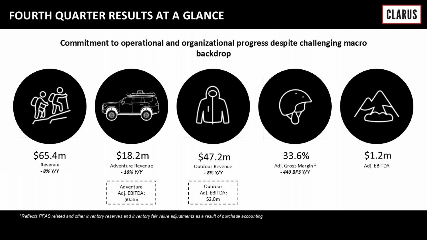Commitment to operational and organizational progress despite challenging macro backdrop $ 65.4m $ 18.2m $47.2 m 33.6 % $ 1.2m Revenue - 8% Y/Y Adventure Revenue - 10% Y/Y Outdoor Revenue - 8% Y/Y Adj. Gross Margin 1 - 440 BPS Y/Y Adj. EBITDA FOURTH QUARTER RESULTS AT A GLANCE Adventure Adj. EBITDA: $0.3m Outdoor Adj. EBITDA: $2.0m 1 Reflects PFAS related and other inventory reserves and inventory fair value adjustments as a result of purchase accounting