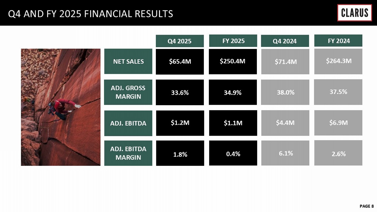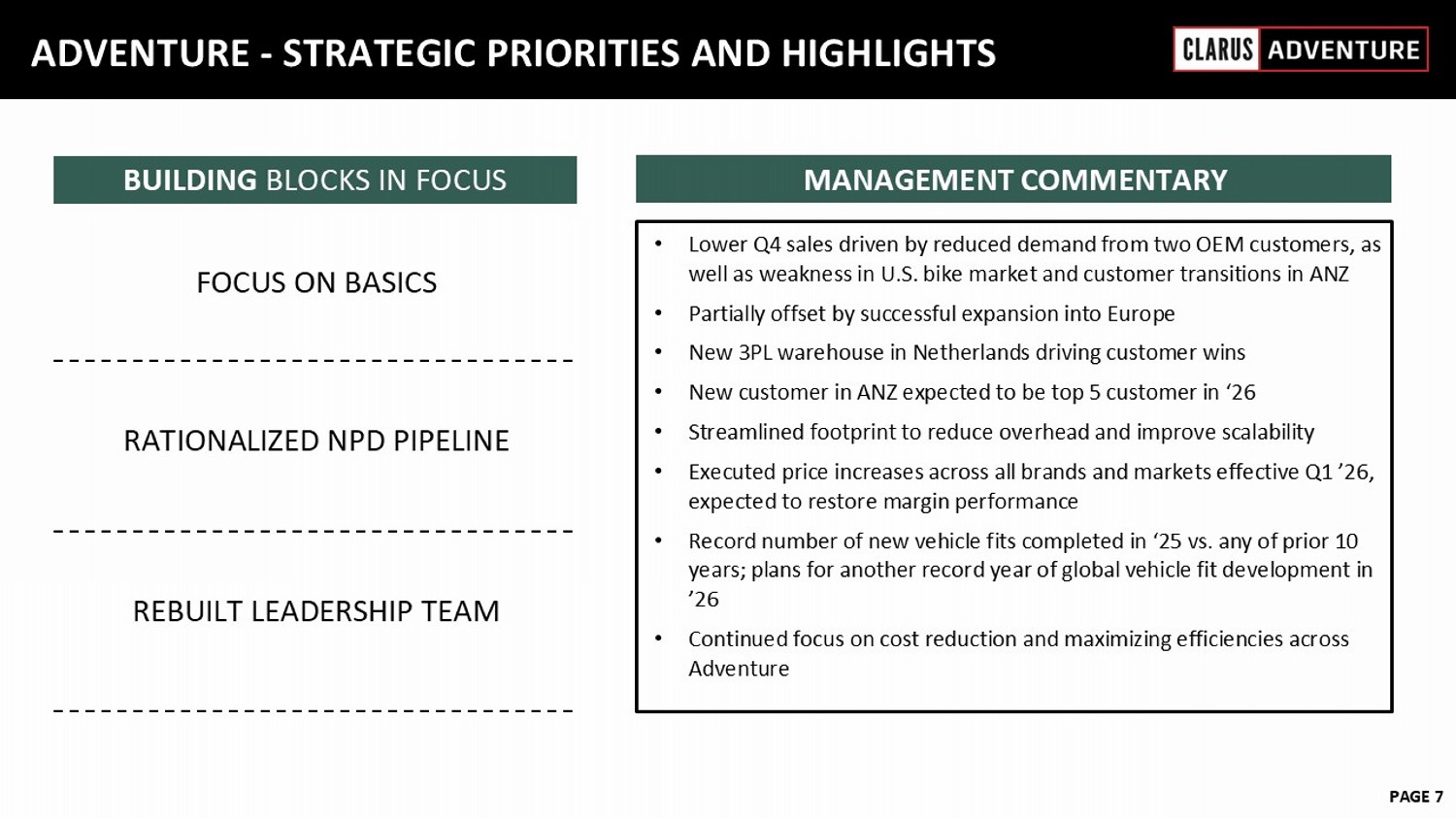 6 February 2023 PAGE 7 ADVENTURE - STRATEGIC PRIORITIES AND HIGHLIGHTS • Lower Q4 sales driven by reduced demand from two OEM customers, as well as weakness in U.S. bike market and customer transitions in ANZ • Partially offset by successful expansion into Europe • New 3PL warehouse in Netherlands driving customer wins • New customer in ANZ expected to be top 5 customer in ‘26 • Streamlined footprint to reduce overhead and improve scalability • Executed price increases across all brands and markets effective Q1 ’26, expected to restore margin performance • Record number of new vehicle fits completed in ‘25 vs. any of prior 10 years; plans for another record year of global vehicle fit development in ’26 • Continued focus on cost reduction and maximizing efficiencies across Adventure MANAGEMENT COMMENTARY BUILDING BLOCKS IN FOCUS FOCUS ON BASICS RATIONALIZED NPD PIPELINE REBUILT LEADERSHIP TEAM