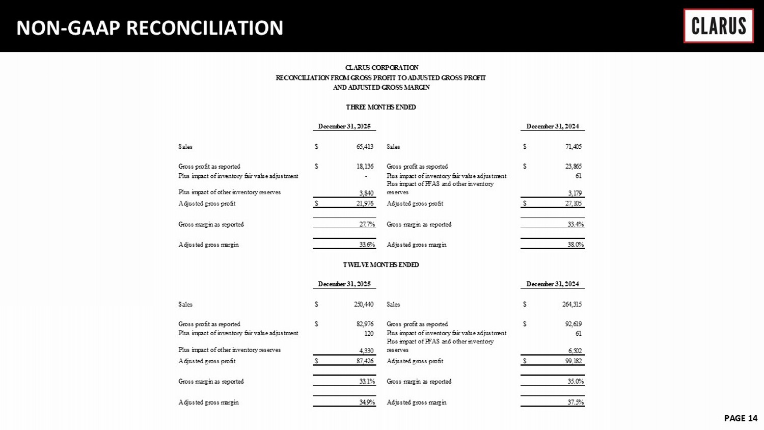 6 February 2023 PAGE 14 NON - GAAP RECONCILIATION Sales $ 65,413 Sales $ 71,405 Gross profit as reported $ 18,136 Gross profit as reported $ 23,865 Plus impact of inventory fair value adjustment - Plus impact of inventory fair value adjustment 61 Plus impact of other inventory reserves 3,840 Plus impact of PFAS and other inventory reserves 3,179 Adjusted gross profit $ 21,976 Adjusted gross profit $ 27,105 Gross margin as reported 27.7% Gross margin as reported 33.4% Adjusted gross margin 33.6% Adjusted gross margin 38.0% Sales $ 250,440 Sales $ 264,315 Gross profit as reported $ 82,976 Gross profit as reported $ 92,619 Plus impact of inventory fair value adjustment 120 Plus impact of inventory fair value adjustment 61 Plus impact of other inventory reserves 4,330 Plus impact of PFAS and other inventory reserves 6,502 Adjusted gross profit $ 87,426 Adjusted gross profit $ 99,182 Gross margin as reported 33.1% Gross margin as reported 35.0% Adjusted gross margin 34.9% Adjusted gross margin 37.5% TWELVE MONTHS ENDED December 31, 2025 December 31, 2024 CLARUS CORPORATION RECONCILIATION FROM GROSS PROFIT TO ADJUSTED GROSS PROFIT AND ADJUSTED GROSS MARGIN THREE MONTHS ENDED December 31, 2025 December 31, 2024