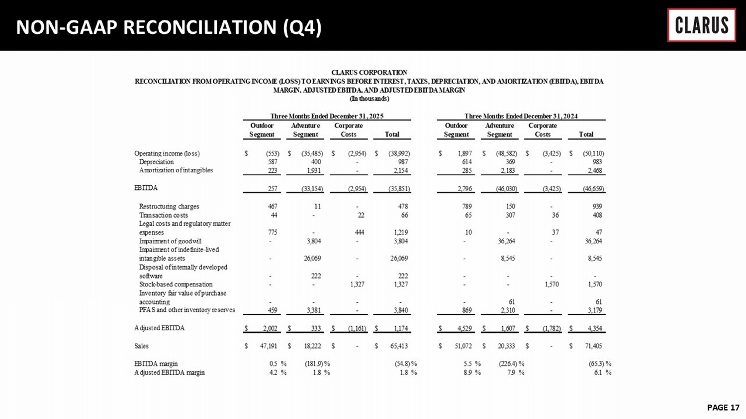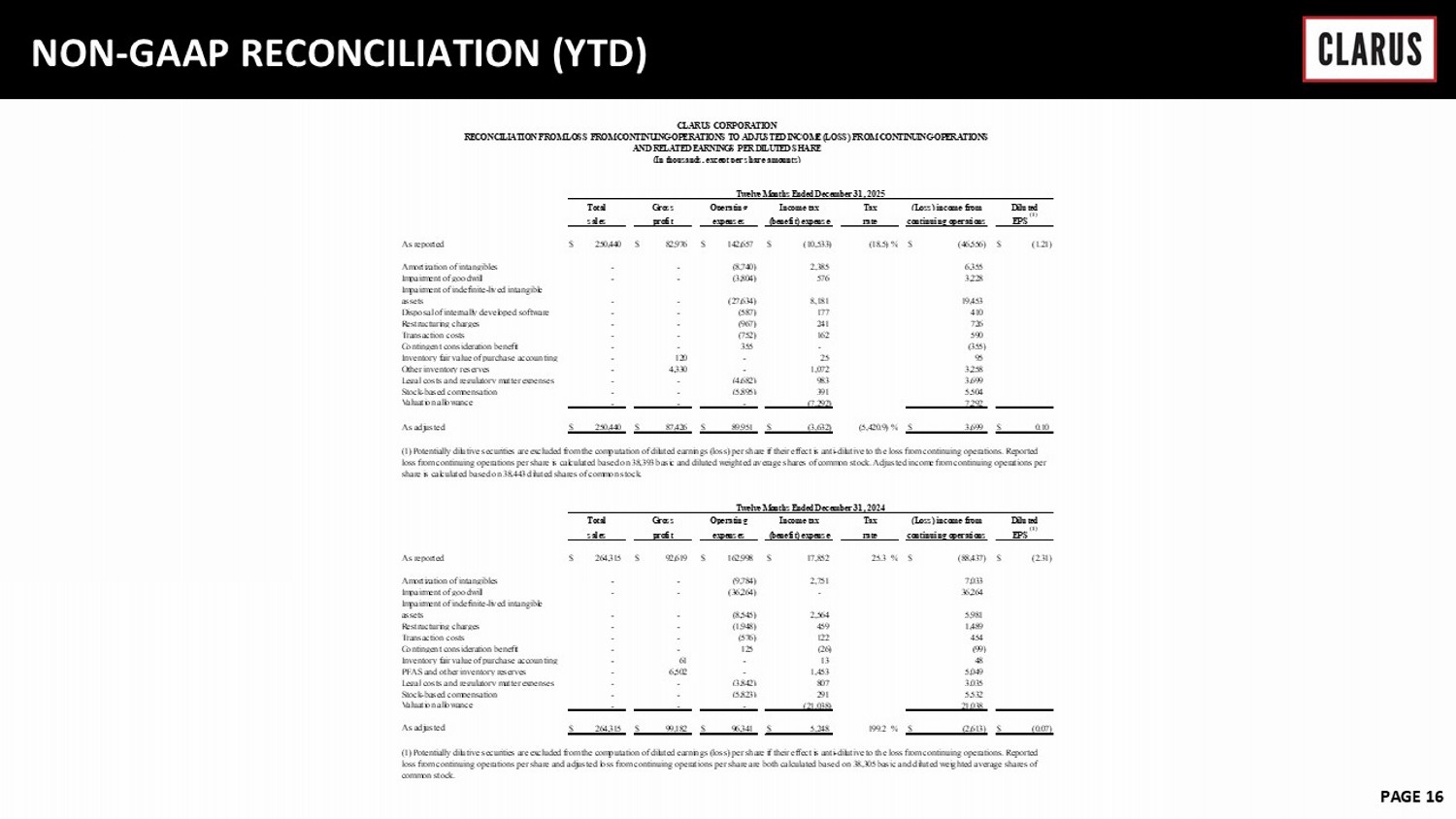 6 February 2023 PAGE 15 NON - GAAP RECONCILIATION (Q4) As reported $ 65,413 $ 18,136 $ 57,128 $ (6,656) (17.6) % $ (31,261) $ (0.81) Amortization of intangibles - - (2,154) 122 2,032 Impairment of goodwill - - (3,804) 576 3,228 Impairment of indefinite-lived intangible assets - - (26,069) 8,181 17,888 Disposal of internally developed software - - (222) - 222 Restructuring charges - - (478) 55 423 Transaction costs - - (66) 163 (97) Other inventory reserves - 3,840 - 1,072 2,768 Legal costs and regulatory matter expenses - - (1,219) 986 233 Stock-based compensation - - (1,327) 392 935 Valuation allowance - - - (7,292) 7,292 As adjusted $ 65,413 $ 21,976 $ 21,789 $ (2,376) (188.3) % $ 3,638 $ 0.09 As reported $ 71,405 $ 23,865 $ 73,975 $ 21,142 40.5 % $ (73,325) $ (1.92) Amortization of intangibles - - (2,468) 1,240 1,228 Impairment of goodwill - - (36,264) - 36,264 Impairment of indefinite-lived intangible assets - - (8,545) 2,564 5,981 Restructuring charges - - (939) 251 688 Transaction costs - - (408) 87 321 Inventory fair value of purchase accounting - 61 - 13 48 PFAS and other inventory reserves - 3,179 - 766 2,413 Legal costs and regulatory matter expenses - - (47) 23 24 Stock-based compensation - - (1,570) (588) 2,158 Valuation allowance - - - (21,038) 21,038 As adjusted $ 71,405 $ 27,105 $ 23,734 $ 4,460 343.6 % $ (3,162) $ (0.08) CLARUS CORPORATION RECONCILIATION FROM LOSS FROM CONTINUING OPERATIONS TO ADJUSTED INCOME (LOSS) FROM CONTINUING OPERATIONS AND RELATED EARNINGS PER DILUTED SHARE (In thousands, except per share amounts) Three Months Ended December 31, 2025 Total Gross Operating Income tax Tax (Loss) income from Diluted sales profit expenses (benefit) expense rate continuing operations EPS (1) (1) Potentially dilutive securities are excluded from the computation of diluted earnings (loss) per share if their effect is anti-dilutive to the loss from continuing operations. Reported loss from continuing operations per share is calculated based on 38,402 basic and diluted weighted average shares of common stock. Adjusted income from continuing operations per share is calculated based on 38,452 diluted shares of common stock. Three Months Ended December 31, 2024 Total Gross Operating Income tax continuing operations EPS (1) (1) Potentially dilutive securities are excluded from the computation of diluted earnings (loss) per share if their effect is anti-dilutive to the loss from continuing operations. Reported loss from continuing operations per share and adjusted loss from continuing operations per share are both calculated based on 38,262 basic and diluted weighted average shares of common stock. Tax (Loss) income from Diluted sales profit expenses (benefit) expense rate