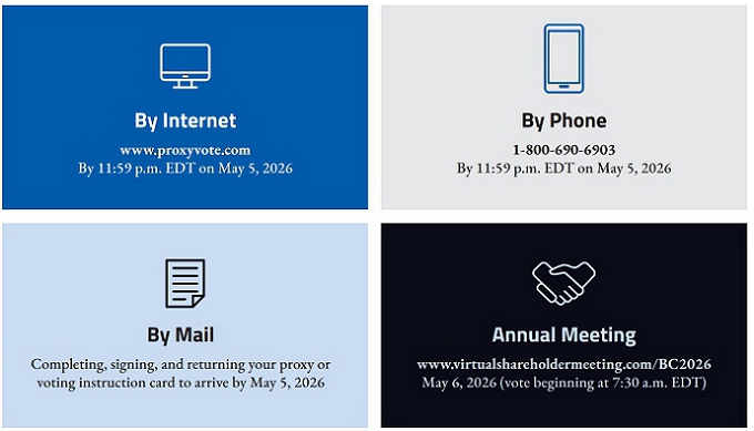 We invite you to join us for our annual meeting of shareholders, which will be conducted via live audio webcast on May 6, 2026. You may attend the virtual meeting of shareholders online and submit your questions during the meeting by visiting www.virtualshareholdermeeting.com/BC2026. We look forward to your attendance and participation again this year.