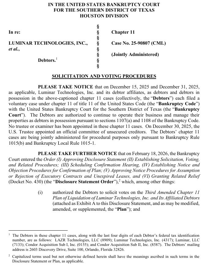 SOLICITING VOTES ON THE THIRD AMENDED CHAPTER 11 PLAN OF LIQUIDATION OF LUMINAR TECHNOLOGIES, INC. AND ITS AFFILIATED DEBTORS, DATED FEBRUARY 18, 2026 (THE “PLAN”),2 AND MAY NOT BE RELIED UPON FOR ANY PURPOSE OTHER THAN TO DETERMINE HOW TO VOTE ON THE PLAN. A COPY OF THE PLAN IS ANNEXED HERETO AS EXHIBIT A. NO SOLICITATION OF VOTES TO ACCEPT OR REJECT THE