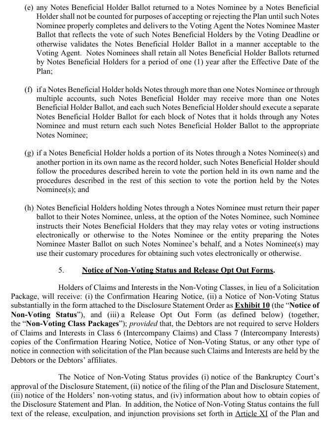 and Release Opt Out Forms. Holders of Claims and Interests in the Non-Voting Classes, in lieu of a Solicitation Package, will receive: (i) the Confirmation Hearing Notice, (ii) a Notice of Non-Voting Status substantially in the form attached