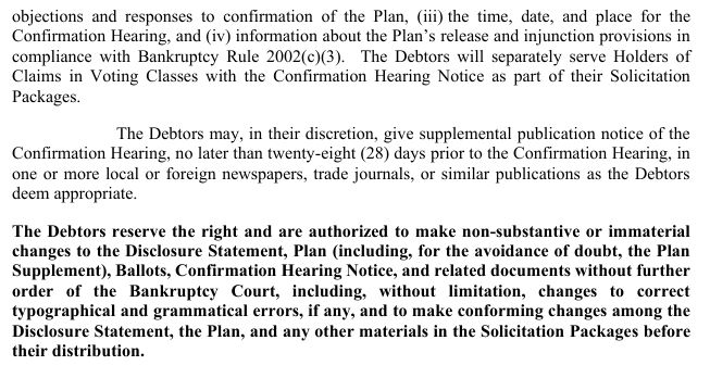 Statement, Plan (including, for the avoidance of doubt, the Plan Supplement), Ballots, Confirmation Hearing Notice, and related documents without further order of the Bankruptcy Court, including, without limitation, changes to correct