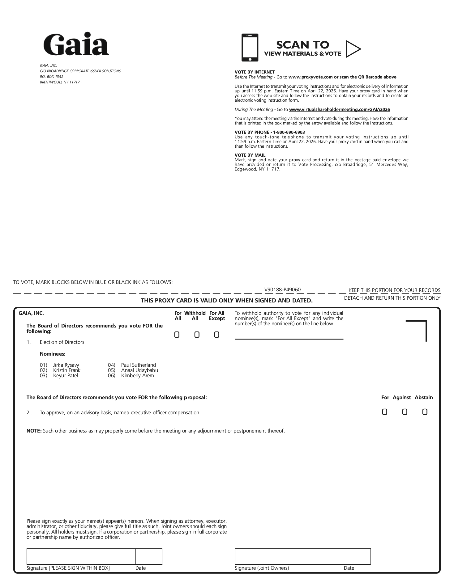 As part of our Code of Ethics, directors, officers, and employees are expected to make business decisions and take actions based upon the best interests of Gaia and not based upon personal relationships or benefits.