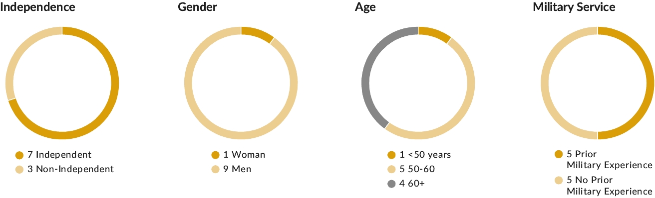 Clayton Hutmacher Lead Independent Director Independent Age 64 Director Since June 2024 Committee Service: • Compensation Committee • Nominating and Corporate Governance Committee | Clayton Hutmacher is a director on our Board and currently serves as the Lead Independent Director and as a member of the compensation committee and nominating and corporate governance committee. Mr. Hutmacher has been the President and Chief Executive Officer of the Special Operations Warrior Foundation since September 2018. Mr. Hutmacher was a career United States Army Officer and retired in 2018 having served over 40 years in uniform. As an Army Special Operations Aviator, he commanded at every level during his three tours with the 160th Special Operations Aviation Regiment, where he served as the MH-60 Direct Action Penetrator platoon leader, company operations officer, executive officer and commander of 1st Battalion, Regimental Commander, and the Commanding General of the U.S Army Special Operation Command, Tampa, Florida. Mr. Hutmacher’s last active duty assignment was as the deputy Commanding General of the United States Army Special Operations Command at Fort Bragg, NC. Mr. Hutmacher has a Bachelor’s Degree in Aerospace Management from Embry Riddle Aeronautical University, a Master’s Degree in National Security and Strategic Studies from the United States Naval Command and Staff College, and a Master’s Degree in Strategic Studies from the United States Army War College. | ||