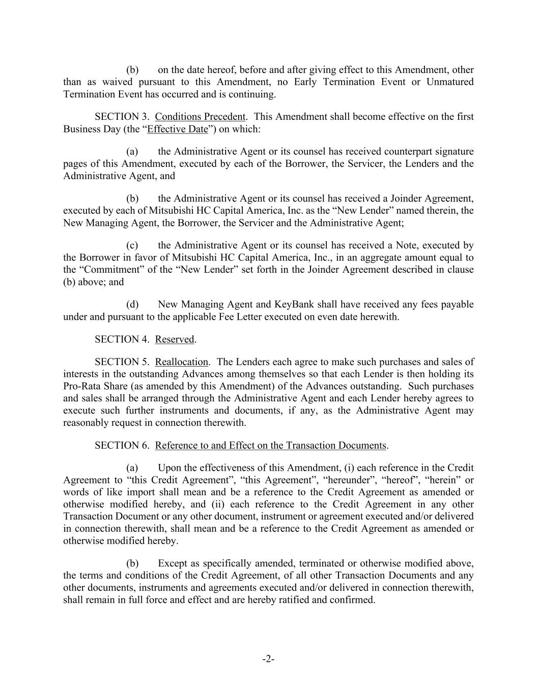 -2- (b) on the date hereof, before and after giving effect to this Amendment, other than as waived pursuant to this Amendment, no Early Termination Event or Unmatured Termination Event has occurred and is continuing. SECTION 3. Conditions Precedent. This Amendment shall become effective on the first Business Day (the “Effective Date”) on which: (a) the Administrative Agent or its counsel has received counterpart signature pages of this Amendment, executed by each of the Borrower, the Servicer, the Lenders and the Administrative Agent, and (b) the Administrative Agent or its counsel has received a Joinder Agreement, executed by each of Mitsubishi HC Capital America, Inc. as the “New Lender” named therein, the New Managing Agent, the Borrower, the Servicer and the Administrative Agent; (c) the Administrative Agent or its counsel has received a Note, executed by the Borrower in favor of Mitsubishi HC Capital America, Inc., in an aggregate amount equal to the “Commitment” of the “New Lender” set forth in the Joinder Agreement described in clause (b) above; and (d) New Managing Agent and KeyBank shall have received any fees payable under and pursuant to the applicable Fee Letter executed on even date herewith. SECTION 4. Reserved. SECTION 5. Reallocation. The Lenders each agree to make such purchases and sales of interests in the outstanding Advances among themselves so that each Lender is then holding its Pro-Rata Share (as amended by this Amendment) of the Advances outstanding. Such purchases and sales shall be arranged through the Administrative Agent and each Lender hereby agrees to execute such further instruments and documents, if any, as the Administrative Agent may reasonably request in connection therewith. SECTION 6. Reference to and Effect on the Transaction Documents. (a) Upon the effectiveness of this Amendment, (i) each reference in the Credit Agreement to “this Credit Agreement”, “this Agreement”, “hereunder”, “hereof”, “herein” or words of like import shall mean and be a reference to the Credit Agreement as amended or otherwise modified hereby, and (ii) each reference to the Credit Agreement in any other Transaction Document or any other document, instrument or agreement executed and/or delivered in connection therewith, shall mean and be a reference to the Credit Agreement as amended or otherwise modified hereby. (b) Except as specifically amended, terminated or otherwise modified above, the terms and conditions of the Credit Agreement, of all other Transaction Documents and any other documents, instruments and agreements executed and/or delivered in connection therewith, shall remain in full force and effect and are hereby ratified and confirmed.