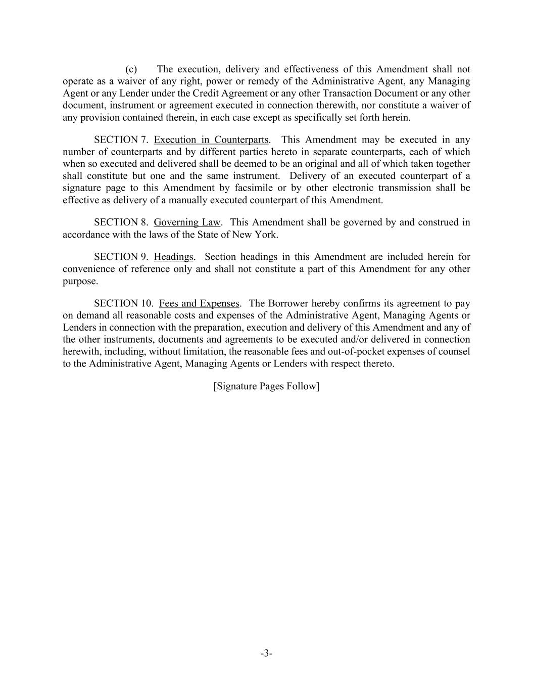 -3- (c) The execution, delivery and effectiveness of this Amendment shall not operate as a waiver of any right, power or remedy of the Administrative Agent, any Managing Agent or any Lender under the Credit Agreement or any other Transaction Document or any other document, instrument or agreement executed in connection therewith, nor constitute a waiver of any provision contained therein, in each case except as specifically set forth herein. SECTION 7. Execution in Counterparts. This Amendment may be executed in any number of counterparts and by different parties hereto in separate counterparts, each of which when so executed and delivered shall be deemed to be an original and all of which taken together shall constitute but one and the same instrument. Delivery of an executed counterpart of a signature page to this Amendment by facsimile or by other electronic transmission shall be effective as delivery of a manually executed counterpart of this Amendment. SECTION 8. Governing Law. This Amendment shall be governed by and construed in accordance with the laws of the State of New York. SECTION 9. Headings. Section headings in this Amendment are included herein for convenience of reference only and shall not constitute a part of this Amendment for any other purpose. SECTION 10. Fees and Expenses. The Borrower hereby confirms its agreement to pay on demand all reasonable costs and expenses of the Administrative Agent, Managing Agents or Lenders in connection with the preparation, execution and delivery of this Amendment and any of the other instruments, documents and agreements to be executed and/or delivered in connection herewith, including, without limitation, the reasonable fees and out-of-pocket expenses of counsel to the Administrative Agent, Managing Agents or Lenders with respect thereto. [Signature Pages Follow]
