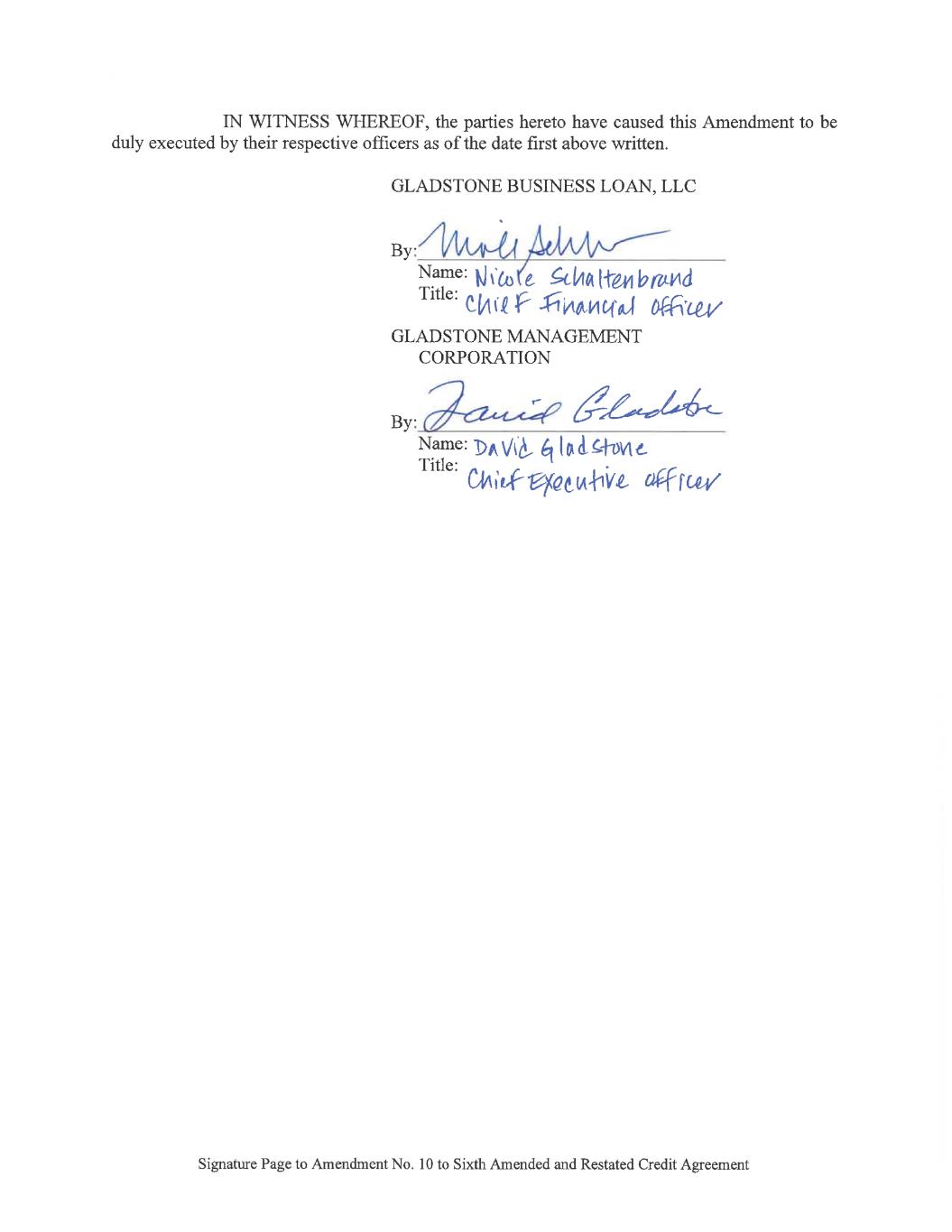 Signature Page to Sixth Amended and Restated Credit Agreement IN WITNESS WHEREOF, the parties hereto have caused this Agreement to be duly executed by their respective officers as of the date first above written. GLADSTONE BUSINESS LOAN, LLC By:_________________________________ Name: Title: GLADSTONE MANAGEMENT CORPORATION By:_________________________________ Name: Title: