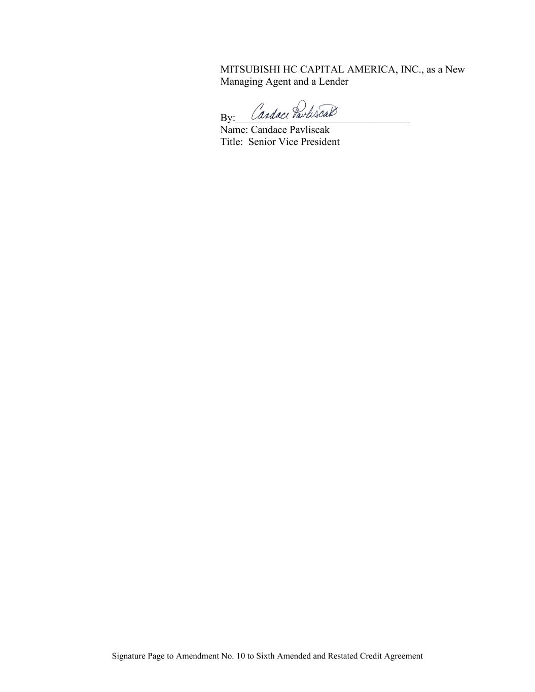 Signature Page to Amendment No. 10 to Sixth Amended and Restated Credit Agreement MITSUBISHI HC CAPITAL AMERICA, INC., as a New Managing Agent and a Lender By:_________________________________ Name: Candace Pavliscak Title: Senior Vice President