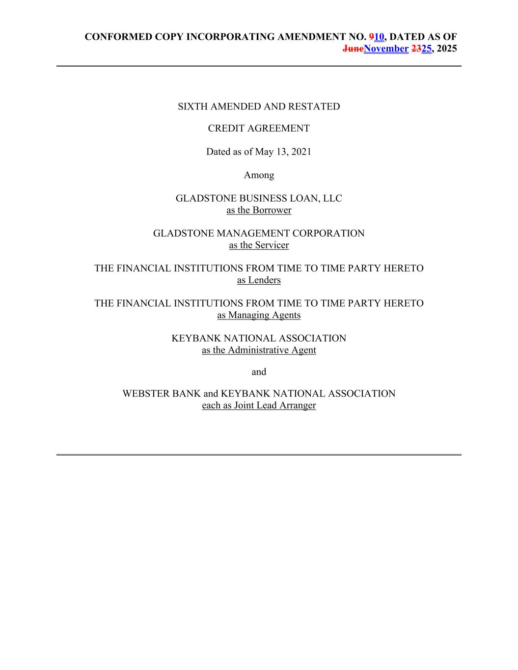 CONFORMED COPY INCORPORATING AMENDMENT NO. 910, DATED AS OF JuneNovember 2325, 2025 SIXTH AMENDED AND RESTATED CREDIT AGREEMENT Dated as of May 13, 2021 Among GLADSTONE BUSINESS LOAN, LLC as the Borrower GLADSTONE MANAGEMENT CORPORATION as the Servicer THE FINANCIAL INSTITUTIONS FROM TIME TO TIME PARTY HERETO as Lenders THE FINANCIAL INSTITUTIONS FROM TIME TO TIME PARTY HERETO as Managing Agents KEYBANK NATIONAL ASSOCIATION as the Administrative Agent and WEBSTER BANK and KEYBANK NATIONAL ASSOCIATION each as Joint Lead Arranger