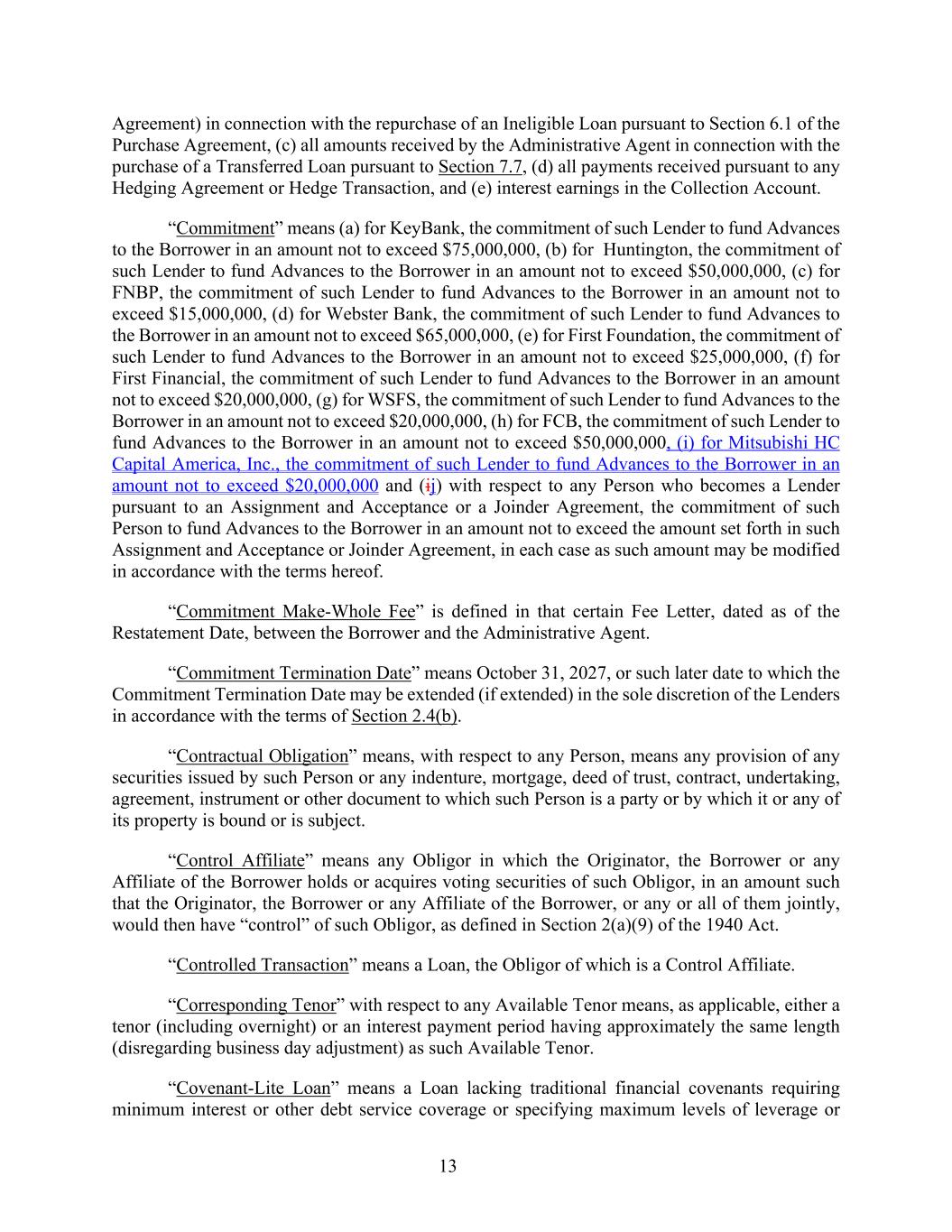 13 Agreement) in connection with the repurchase of an Ineligible Loan pursuant to Section 6.1 of the Purchase Agreement, (c) all amounts received by the Administrative Agent in connection with the purchase of a Transferred Loan pursuant to Section 7.7, (d) all payments received pursuant to any Hedging Agreement or Hedge Transaction, and (e) interest earnings in the Collection Account. “Commitment” means (a) for KeyBank, the commitment of such Lender to fund Advances to the Borrower in an amount not to exceed $75,000,000, (b) for Huntington, the commitment of such Lender to fund Advances to the Borrower in an amount not to exceed $50,000,000, (c) for FNBP, the commitment of such Lender to fund Advances to the Borrower in an amount not to exceed $15,000,000, (d) for Webster Bank, the commitment of such Lender to fund Advances to the Borrower in an amount not to exceed $65,000,000, (e) for First Foundation, the commitment of such Lender to fund Advances to the Borrower in an amount not to exceed $25,000,000, (f) for First Financial, the commitment of such Lender to fund Advances to the Borrower in an amount not to exceed $20,000,000, (g) for WSFS, the commitment of such Lender to fund Advances to the Borrower in an amount not to exceed $20,000,000, (h) for FCB, the commitment of such Lender to fund Advances to the Borrower in an amount not to exceed $50,000,000, (i) for Mitsubishi HC Capital America, Inc., the commitment of such Lender to fund Advances to the Borrower in an amount not to exceed $20,000,000 and (ij) with respect to any Person who becomes a Lender pursuant to an Assignment and Acceptance or a Joinder Agreement, the commitment of such Person to fund Advances to the Borrower in an amount not to exceed the amount set forth in such Assignment and Acceptance or Joinder Agreement, in each case as such amount may be modified in accordance with the terms hereof. “Commitment Make-Whole Fee” is defined in that certain Fee Letter, dated as of the Restatement Date, between the Borrower and the Administrative Agent. “Commitment Termination Date” means October 31, 2027, or such later date to which the Commitment Termination Date may be extended (if extended) in the sole discretion of the Lenders in accordance with the terms of Section 2.4(b). “Contractual Obligation” means, with respect to any Person, means any provision of any securities issued by such Person or any indenture, mortgage, deed of trust, contract, undertaking, agreement, instrument or other document to which such Person is a party or by which it or any of its property is bound or is subject. “Control Affiliate” means any Obligor in which the Originator, the Borrower or any Affiliate of the Borrower holds or acquires voting securities of such Obligor, in an amount such that the Originator, the Borrower or any Affiliate of the Borrower, or any or all of them jointly, would then have “control” of such Obligor, as defined in Section 2(a)(9) of the 1940 Act. “Controlled Transaction” means a Loan, the Obligor of which is a Control Affiliate. “Corresponding Tenor” with respect to any Available Tenor means, as applicable, either a tenor (including overnight) or an interest payment period having approximately the same length (disregarding business day adjustment) as such Available Tenor. “Covenant-Lite Loan” means a Loan lacking traditional financial covenants requiring minimum interest or other debt service coverage or specifying maximum levels of leverage or