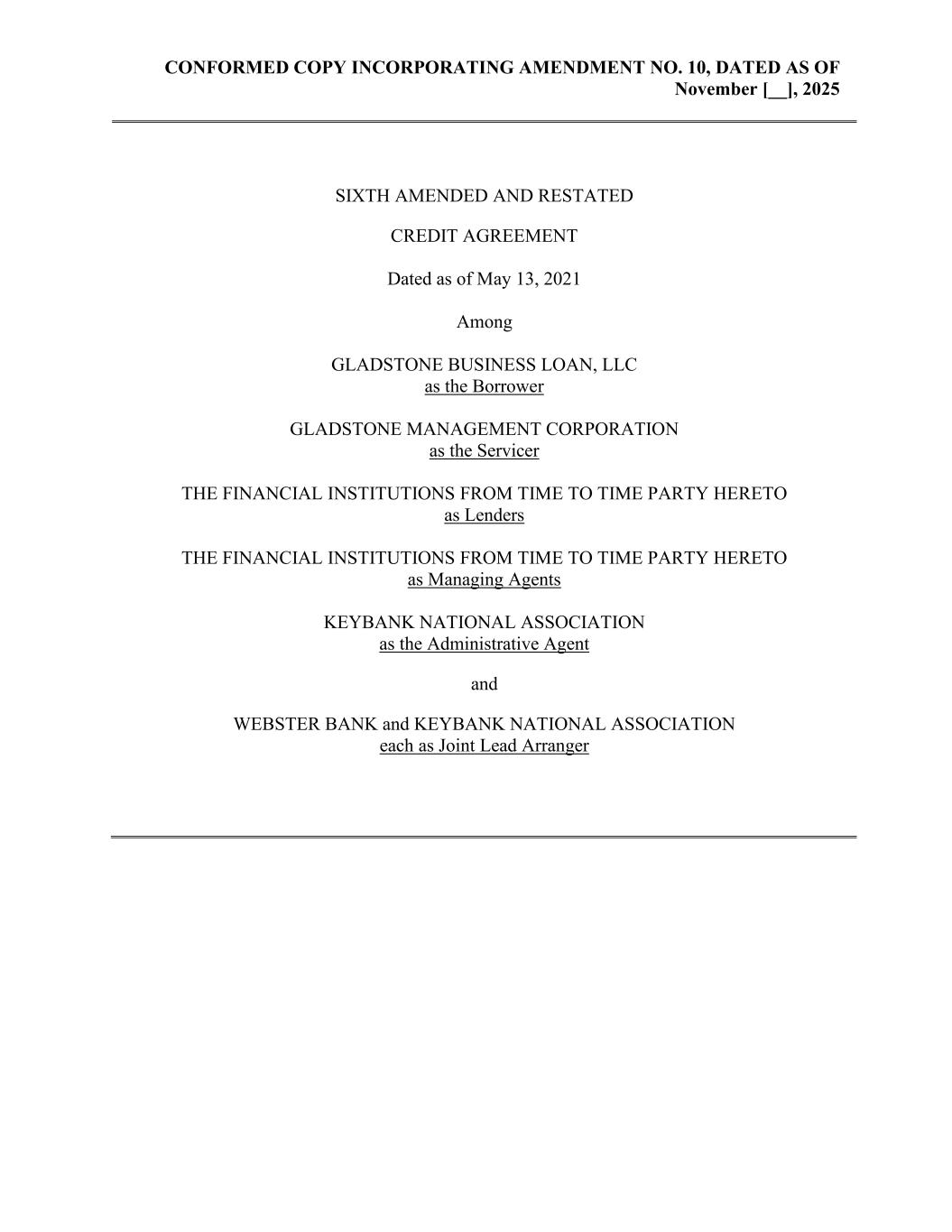 CONFORMED COPY INCORPORATING AMENDMENT NO. 10, DATED AS OF November [__], 2025 SIXTH AMENDED AND RESTATED CREDIT AGREEMENT Dated as of May 13, 2021 Among GLADSTONE BUSINESS LOAN, LLC as the Borrower GLADSTONE MANAGEMENT CORPORATION as the Servicer THE FINANCIAL INSTITUTIONS FROM TIME TO TIME PARTY HERETO as Lenders THE FINANCIAL INSTITUTIONS FROM TIME TO TIME PARTY HERETO as Managing Agents KEYBANK NATIONAL ASSOCIATION as the Administrative Agent and WEBSTER BANK and KEYBANK NATIONAL ASSOCIATION each as Joint Lead Arranger