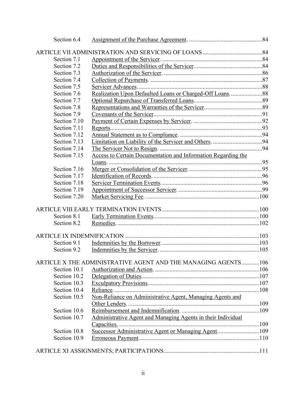 ii Section 6.4 Assignment of the Purchase Agreement. .................................................84 ARTICLE VII ADMINISTRATION AND SERVICING OF LOANS ........................................84 Section 7.1 Appointment of the Servicer. ...................................................................84 Section 7.2 Duties and Responsibilities of the Servicer. .............................................84 Section 7.3 Authorization of the Servicer. ..................................................................86 Section 7.4 Collection of Payments. ...........................................................................87 Section 7.5 Servicer Advances. ...................................................................................88 Section 7.6 Realization Upon Defaulted Loans or Charged-Off Loans. .....................88 Section 7.7 Optional Repurchase of Transferred Loans. .............................................89 Section 7.8 Representations and Warranties of the Servicer. ......................................89 Section 7.9 Covenants of the Servicer. ........................................................................91 Section 7.10 Payment of Certain Expenses by Servicer. ..............................................92 Section 7.11 Reports. .....................................................................................................93 Section 7.12 Annual Statement as to Compliance. .......................................................94 Section 7.13 Limitation on Liability of the Servicer and Others. .................................94 Section 7.14 The Servicer Not to Resign. .....................................................................94 Section 7.15 Access to Certain Documentation and Information Regarding the Loans. .......................................................................................................95 Section 7.16 Merger or Consolidation of the Servicer. .................................................95 Section 7.17 Identification of Records. .........................................................................96 Section 7.18 Servicer Termination Events. ...................................................................96 Section 7.19 Appointment of Successor Servicer. ........................................................99 Section 7.20 Market Servicing Fee. ............................................................................100 ARTICLE VIII EARLY TERMINATION EVENTS .................................................................100 Section 8.1 Early Termination Events. ......................................................................100 Section 8.2 Remedies. ...............................................................................................102 ARTICLE IX INDEMNIFICATION ..........................................................................................103 Section 9.1 Indemnities by the Borrower. .................................................................103 Section 9.2 Indemnities by the Servicer. ...................................................................105 ARTICLE X THE ADMINISTRATIVE AGENT AND THE MANAGING AGENTS ............106 Section 10.1 Authorization and Action. ......................................................................106 Section 10.2 Delegation of Duties. ..............................................................................107 Section 10.3 Exculpatory Provisions. ..........................................................................107 Section 10.4 Reliance. .................................................................................................108 Section 10.5 Non-Reliance on Administrative Agent, Managing Agents and Other Lenders. ........................................................................................109 Section 10.6 Reimbursement and Indemnification. ....................................................109 Section 10.7 Administrative Agent and Managing Agents in their Individual Capacities. ..............................................................................................109 Section 10.8 Successor Administrative Agent or Managing Agent. ...........................109 Section 10.9 Erroneous Payment. ................................................................................110 ARTICLE XI ASSIGNMENTS; PARTICIPATIONS ................................................................111