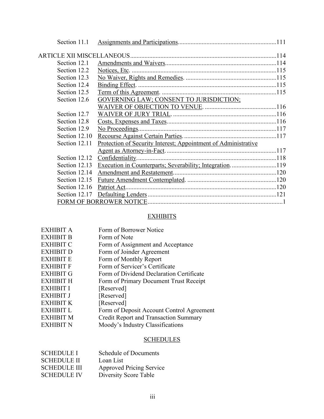 iii Section 11.1 Assignments and Participations. .............................................................111 ARTICLE XII MISCELLANEOUS ............................................................................................114 Section 12.1 Amendments and Waivers. .....................................................................114 Section 12.2 Notices, Etc. ...........................................................................................115 Section 12.3 No Waiver, Rights and Remedies. .........................................................115 Section 12.4 Binding Effect. .......................................................................................115 Section 12.5 Term of this Agreement. ........................................................................115 Section 12.6 GOVERNING LAW; CONSENT TO JURISDICTION; WAIVER OF OBJECTION TO VENUE. .............................................116 Section 12.7 WAIVER OF JURY TRIAL. .................................................................116 Section 12.8 Costs, Expenses and Taxes. ....................................................................116 Section 12.9 No Proceedings. ......................................................................................117 Section 12.10 Recourse Against Certain Parties. ..........................................................117 Section 12.11 Protection of Security Interest; Appointment of Administrative Agent as Attorney-in-Fact. .....................................................................117 Section 12.12 Confidentiality. .......................................................................................118 Section 12.13 Execution in Counterparts; Severability; Integration. ............................119 Section 12.14 Amendment and Restatement. ................................................................120 Section 12.15 Future Amendment Contemplated. ........................................................120 Section 12.16 Patriot Act. ..............................................................................................120 Section 12.17 Defaulting Lenders .................................................................................121 FORM OF BORROWER NOTICE .....................................................................................1 EXHIBITS EXHIBIT A Form of Borrower Notice EXHIBIT B Form of Note EXHIBIT C Form of Assignment and Acceptance EXHIBIT D Form of Joinder Agreement EXHIBIT E Form of Monthly Report EXHIBIT F Form of Servicer’s Certificate EXHIBIT G Form of Dividend Declaration Certificate EXHIBIT H Form of Primary Document Trust Receipt EXHIBIT I [Reserved] EXHIBIT J [Reserved] EXHIBIT K [Reserved] EXHIBIT L Form of Deposit Account Control Agreement EXHIBIT M Credit Report and Transaction Summary EXHIBIT N Moody’s Industry Classifications SCHEDULES SCHEDULE I Schedule of Documents SCHEDULE II Loan List SCHEDULE III Approved Pricing Service SCHEDULE IV Diversity Score Table