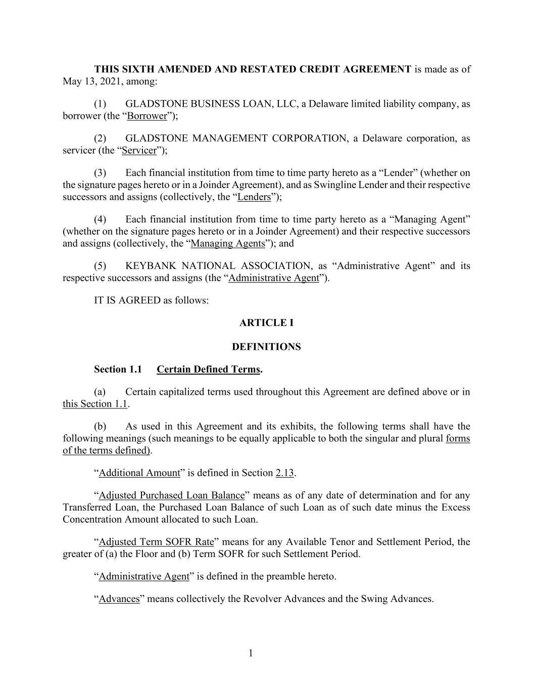 1 THIS SIXTH AMENDED AND RESTATED CREDIT AGREEMENT is made as of May 13, 2021, among: (1) GLADSTONE BUSINESS LOAN, LLC, a Delaware limited liability company, as borrower (the “Borrower”); (2) GLADSTONE MANAGEMENT CORPORATION, a Delaware corporation, as servicer (the “Servicer”); (3) Each financial institution from time to time party hereto as a “Lender” (whether on the signature pages hereto or in a Joinder Agreement), and as Swingline Lender and their respective successors and assigns (collectively, the “Lenders”); (4) Each financial institution from time to time party hereto as a “Managing Agent” (whether on the signature pages hereto or in a Joinder Agreement) and their respective successors and assigns (collectively, the “Managing Agents”); and (5) KEYBANK NATIONAL ASSOCIATION, as “Administrative Agent” and its respective successors and assigns (the “Administrative Agent”). IT IS AGREED as follows: ARTICLE I DEFINITIONS Section 1.1 Certain Defined Terms. (a) Certain capitalized terms used throughout this Agreement are defined above or in this Section 1.1. (b) As used in this Agreement and its exhibits, the following terms shall have the following meanings (such meanings to be equally applicable to both the singular and plural forms of the terms defined). “Additional Amount” is defined in Section 2.13. “Adjusted Purchased Loan Balance” means as of any date of determination and for any Transferred Loan, the Purchased Loan Balance of such Loan as of such date minus the Excess Concentration Amount allocated to such Loan. “Adjusted Term SOFR Rate” means for any Available Tenor and Settlement Period, the greater of (a) the Floor and (b) Term SOFR for such Settlement Period. “Administrative Agent” is defined in the preamble hereto. “Advances” means collectively the Revolver Advances and the Swing Advances.