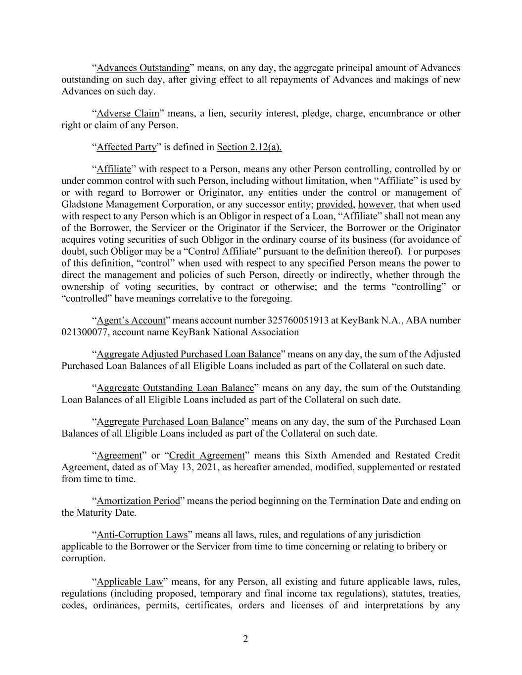 2 “Advances Outstanding” means, on any day, the aggregate principal amount of Advances outstanding on such day, after giving effect to all repayments of Advances and makings of new Advances on such day. “Adverse Claim” means, a lien, security interest, pledge, charge, encumbrance or other right or claim of any Person. “Affected Party” is defined in Section 2.12(a). “Affiliate” with respect to a Person, means any other Person controlling, controlled by or under common control with such Person, including without limitation, when “Affiliate” is used by or with regard to Borrower or Originator, any entities under the control or management of Gladstone Management Corporation, or any successor entity; provided, however, that when used with respect to any Person which is an Obligor in respect of a Loan, “Affiliate” shall not mean any of the Borrower, the Servicer or the Originator if the Servicer, the Borrower or the Originator acquires voting securities of such Obligor in the ordinary course of its business (for avoidance of doubt, such Obligor may be a “Control Affiliate” pursuant to the definition thereof). For purposes of this definition, “control” when used with respect to any specified Person means the power to direct the management and policies of such Person, directly or indirectly, whether through the ownership of voting securities, by contract or otherwise; and the terms “controlling” or “controlled” have meanings correlative to the foregoing. “Agent’s Account” means account number 325760051913 at KeyBank N.A., ABA number 021300077, account name KeyBank National Association “Aggregate Adjusted Purchased Loan Balance” means on any day, the sum of the Adjusted Purchased Loan Balances of all Eligible Loans included as part of the Collateral on such date. “Aggregate Outstanding Loan Balance” means on any day, the sum of the Outstanding Loan Balances of all Eligible Loans included as part of the Collateral on such date. “Aggregate Purchased Loan Balance” means on any day, the sum of the Purchased Loan Balances of all Eligible Loans included as part of the Collateral on such date. “Agreement” or “Credit Agreement” means this Sixth Amended and Restated Credit Agreement, dated as of May 13, 2021, as hereafter amended, modified, supplemented or restated from time to time. “Amortization Period” means the period beginning on the Termination Date and ending on the Maturity Date. “Anti-Corruption Laws” means all laws, rules, and regulations of any jurisdiction applicable to the Borrower or the Servicer from time to time concerning or relating to bribery or corruption. “Applicable Law” means, for any Person, all existing and future applicable laws, rules, regulations (including proposed, temporary and final income tax regulations), statutes, treaties, codes, ordinances, permits, certificates, orders and licenses of and interpretations by any