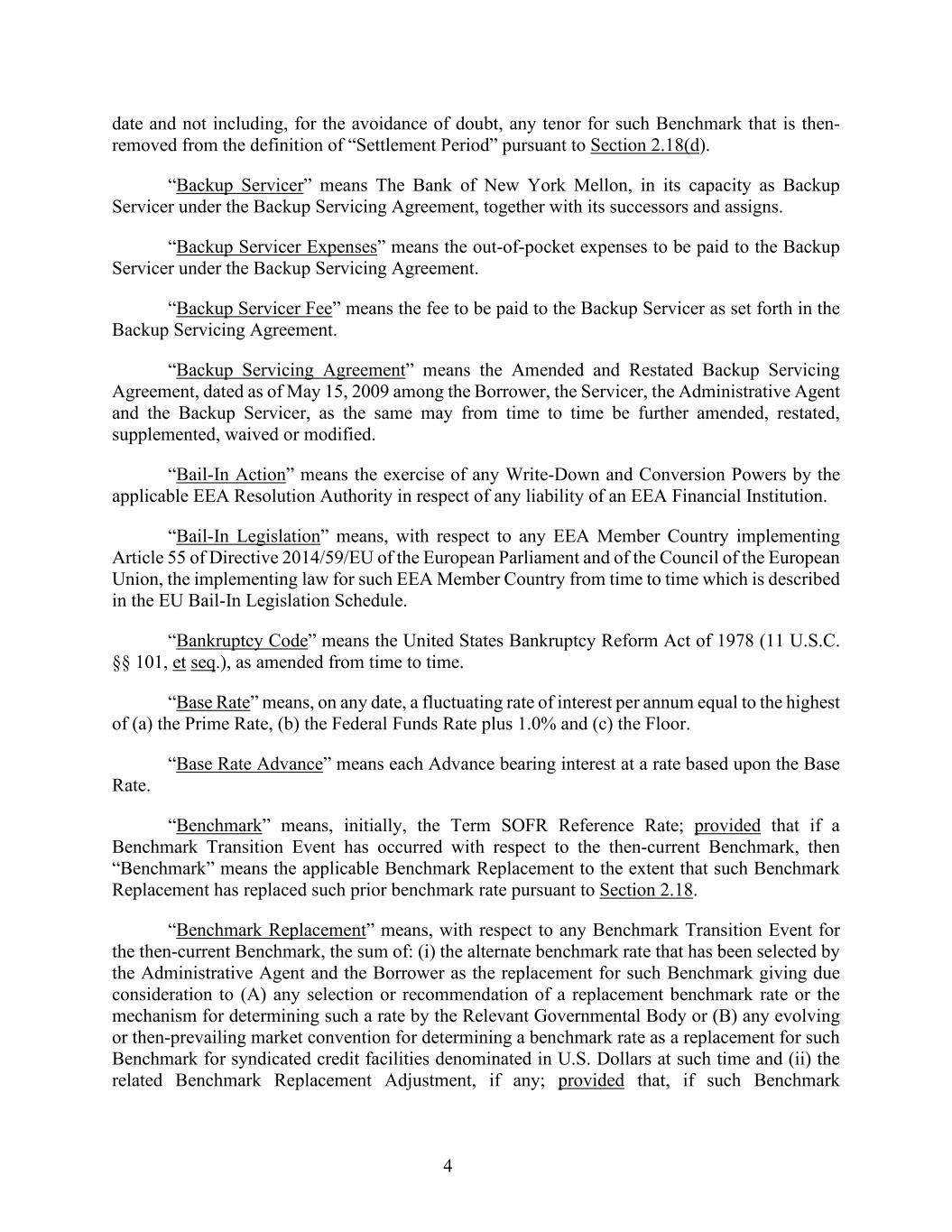 4 date and not including, for the avoidance of doubt, any tenor for such Benchmark that is then- removed from the definition of “Settlement Period” pursuant to Section 2.18(d). “Backup Servicer” means The Bank of New York Mellon, in its capacity as Backup Servicer under the Backup Servicing Agreement, together with its successors and assigns. “Backup Servicer Expenses” means the out-of-pocket expenses to be paid to the Backup Servicer under the Backup Servicing Agreement. “Backup Servicer Fee” means the fee to be paid to the Backup Servicer as set forth in the Backup Servicing Agreement. “Backup Servicing Agreement” means the Amended and Restated Backup Servicing Agreement, dated as of May 15, 2009 among the Borrower, the Servicer, the Administrative Agent and the Backup Servicer, as the same may from time to time be further amended, restated, supplemented, waived or modified. “Bail-In Action” means the exercise of any Write-Down and Conversion Powers by the applicable EEA Resolution Authority in respect of any liability of an EEA Financial Institution. “Bail-In Legislation” means, with respect to any EEA Member Country implementing Article 55 of Directive 2014/59/EU of the European Parliament and of the Council of the European Union, the implementing law for such EEA Member Country from time to time which is described in the EU Bail-In Legislation Schedule. “Bankruptcy Code” means the United States Bankruptcy Reform Act of 1978 (11 U.S.C. §§ 101, et seq.), as amended from time to time. “Base Rate” means, on any date, a fluctuating rate of interest per annum equal to the highest of (a) the Prime Rate, (b) the Federal Funds Rate plus 1.0% and (c) the Floor. “Base Rate Advance” means each Advance bearing interest at a rate based upon the Base Rate. “Benchmark” means, initially, the Term SOFR Reference Rate; provided that if a Benchmark Transition Event has occurred with respect to the then-current Benchmark, then “Benchmark” means the applicable Benchmark Replacement to the extent that such Benchmark Replacement has replaced such prior benchmark rate pursuant to Section 2.18. “Benchmark Replacement” means, with respect to any Benchmark Transition Event for the then-current Benchmark, the sum of: (i) the alternate benchmark rate that has been selected by the Administrative Agent and the Borrower as the replacement for such Benchmark giving due consideration to (A) any selection or recommendation of a replacement benchmark rate or the mechanism for determining such a rate by the Relevant Governmental Body or (B) any evolving or then-prevailing market convention for determining a benchmark rate as a replacement for such Benchmark for syndicated credit facilities denominated in U.S. Dollars at such time and (ii) the related Benchmark Replacement Adjustment, if any; provided that, if such Benchmark