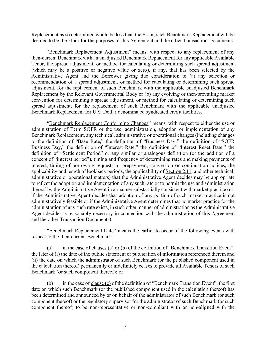 5 Replacement as so determined would be less than the Floor, such Benchmark Replacement will be deemed to be the Floor for the purposes of this Agreement and the other Transaction Documents “Benchmark Replacement Adjustment” means, with respect to any replacement of any then-current Benchmark with an unadjusted Benchmark Replacement for any applicable Available Tenor, the spread adjustment, or method for calculating or determining such spread adjustment (which may be a positive or negative value or zero), if any, that has been selected by the Administrative Agent and the Borrower giving due consideration to (a) any selection or recommendation of a spread adjustment, or method for calculating or determining such spread adjustment, for the replacement of such Benchmark with the applicable unadjusted Benchmark Replacement by the Relevant Governmental Body or (b) any evolving or then-prevailing market convention for determining a spread adjustment, or method for calculating or determining such spread adjustment, for the replacement of such Benchmark with the applicable unadjusted Benchmark Replacement for U.S. Dollar denominated syndicated credit facilities. “Benchmark Replacement Conforming Changes” means, with respect to either the use or administration of Term SOFR or the use, administration, adoption or implementation of any Benchmark Replacement, any technical, administrative or operational changes (including changes to the definition of “Base Rate,” the definition of “Business Day,” the definition of “SOFR Business Day,” the definition of “Interest Rate,” the definition of “Interest Reset Date,” the definition of “Settlement Period” or any similar or analogous definition (or the addition of a concept of “interest period”), timing and frequency of determining rates and making payments of interest, timing of borrowing requests or prepayment, conversion or continuation notices, the applicability and length of lookback periods, the applicability of Section 2.11, and other technical, administrative or operational matters) that the Administrative Agent decides may be appropriate to reflect the adoption and implementation of any such rate or to permit the use and administration thereof by the Administrative Agent in a manner substantially consistent with market practice (or, if the Administrative Agent decides that adoption of any portion of such market practice is not administratively feasible or if the Administrative Agent determines that no market practice for the administration of any such rate exists, in such other manner of administration as the Administrative Agent decides is reasonably necessary in connection with the administration of this Agreement and the other Transaction Documents). “Benchmark Replacement Date” means the earlier to occur of the following events with respect to the then-current Benchmark: (a) in the case of clauses (a) or (b) of the definition of “Benchmark Transition Event”, the later of (i) the date of the public statement or publication of information referenced therein and (ii) the date on which the administrator of such Benchmark (or the published component used in the calculation thereof) permanently or indefinitely ceases to provide all Available Tenors of such Benchmark (or such component thereof); or (b) in the case of clause (c) of the definition of “Benchmark Transition Event”, the first date on which such Benchmark (or the published component used in the calculation thereof) has been determined and announced by or on behalf of the administrator of such Benchmark (or such component thereof) or the regulatory supervisor for the administrator of such Benchmark (or such component thereof) to be non-representative or non-compliant with or non-aligned with the