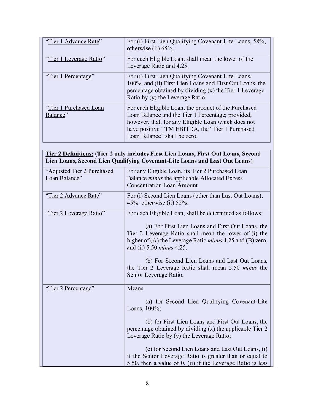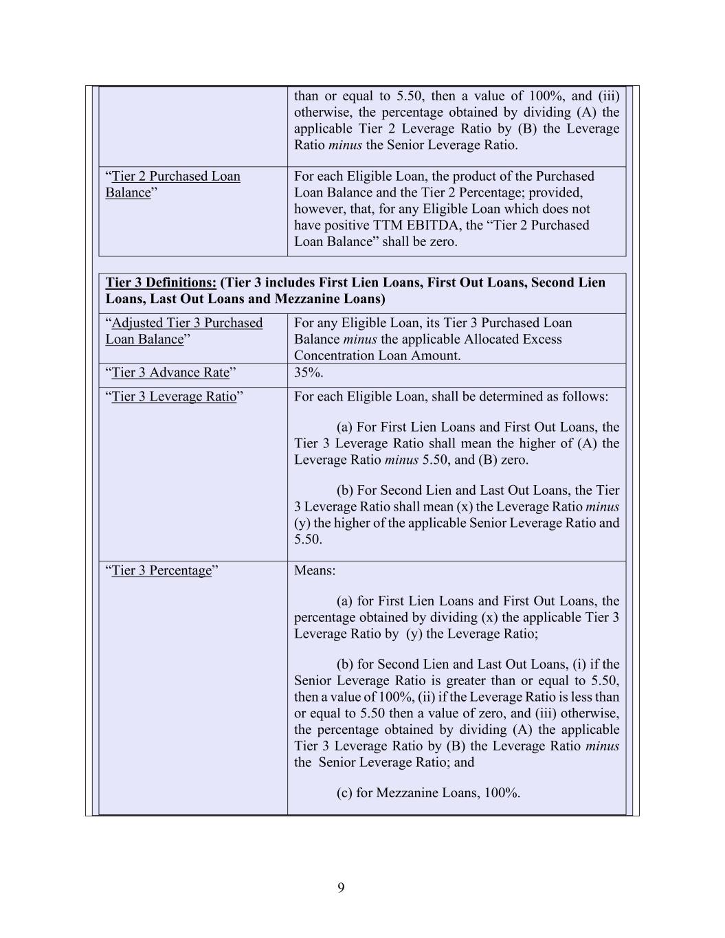 8 “Tier 1 Advance Rate” For (i) First Lien Qualifying Covenant-Lite Loans, 58%, otherwise (ii) 65%. “Tier 1 Leverage Ratio” For each Eligible Loan, shall mean the lower of the Leverage Ratio and 4.25. “Tier 1 Percentage” For (i) First Lien Qualifying Covenant-Lite Loans, 100%, and (ii) First Lien Loans and First Out Loans, the percentage obtained by dividing (x) the Tier 1 Leverage Ratio by (y) the Leverage Ratio. “Tier 1 Purchased Loan Balance” For each Eligible Loan, the product of the Purchased Loan Balance and the Tier 1 Percentage; provided, however, that, for any Eligible Loan which does not have positive TTM EBITDA, the “Tier 1 Purchased Loan Balance” shall be zero. Tier 2 Definitions: (Tier 2 only includes First Lien Loans, First Out Loans, Second Lien Loans, Second Lien Qualifying Covenant-Lite Loans and Last Out Loans) “Adjusted Tier 2 Purchased Loan Balance” For any Eligible Loan, its Tier 2 Purchased Loan Balance minus the applicable Allocated Excess Concentration Loan Amount. “Tier 2 Advance Rate” For (i) Second Lien Loans (other than Last Out Loans), 45%, otherwise (ii) 52%. “Tier 2 Leverage Ratio” For each Eligible Loan, shall be determined as follows: (a) For First Lien Loans and First Out Loans, the Tier 2 Leverage Ratio shall mean the lower of (i) the higher of (A) the Leverage Ratio minus 4.25 and (B) zero, and (ii) 5.50 minus 4.25. (b) For Second Lien Loans and Last Out Loans, the Tier 2 Leverage Ratio shall mean 5.50 minus the Senior Leverage Ratio. “Tier 2 Percentage” Means: (a) for Second Lien Qualifying Covenant-Lite Loans, 100%; (b) for First Lien Loans and First Out Loans, the percentage obtained by dividing (x) the applicable Tier 2 Leverage Ratio by (y) the Leverage Ratio; (c) for Second Lien Loans and Last Out Loans, (i) if the Senior Leverage Ratio is greater than or equal to 5.50, then a value of 0, (ii) if the Leverage Ratio is less