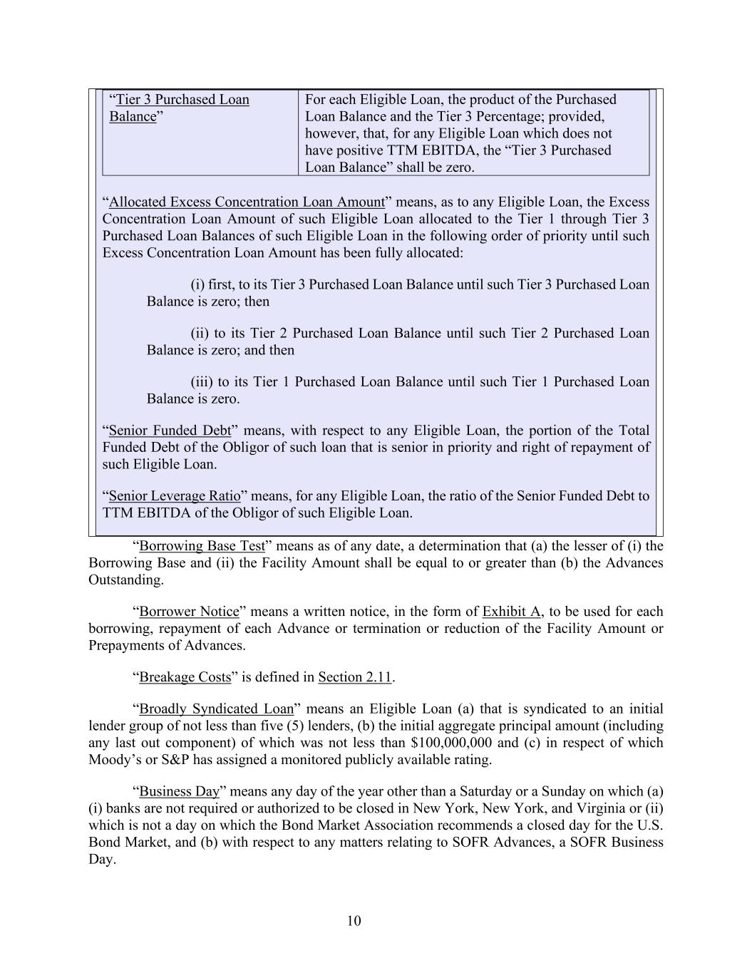 10 “Tier 3 Purchased Loan Balance” For each Eligible Loan, the product of the Purchased Loan Balance and the Tier 3 Percentage; provided, however, that, for any Eligible Loan which does not have positive TTM EBITDA, the “Tier 3 Purchased Loan Balance” shall be zero. “Allocated Excess Concentration Loan Amount” means, as to any Eligible Loan, the Excess Concentration Loan Amount of such Eligible Loan allocated to the Tier 1 through Tier 3 Purchased Loan Balances of such Eligible Loan in the following order of priority until such Excess Concentration Loan Amount has been fully allocated: (i) first, to its Tier 3 Purchased Loan Balance until such Tier 3 Purchased Loan Balance is zero; then (ii) to its Tier 2 Purchased Loan Balance until such Tier 2 Purchased Loan Balance is zero; and then (iii) to its Tier 1 Purchased Loan Balance until such Tier 1 Purchased Loan Balance is zero. “Senior Funded Debt” means, with respect to any Eligible Loan, the portion of the Total Funded Debt of the Obligor of such loan that is senior in priority and right of repayment of such Eligible Loan. “Senior Leverage Ratio” means, for any Eligible Loan, the ratio of the Senior Funded Debt to TTM EBITDA of the Obligor of such Eligible Loan. “Borrowing Base Test” means as of any date, a determination that (a) the lesser of (i) the Borrowing Base and (ii) the Facility Amount shall be equal to or greater than (b) the Advances Outstanding. “Borrower Notice” means a written notice, in the form of Exhibit A, to be used for each borrowing, repayment of each Advance or termination or reduction of the Facility Amount or Prepayments of Advances. “Breakage Costs” is defined in Section 2.11. “Broadly Syndicated Loan” means an Eligible Loan (a) that is syndicated to an initial lender group of not less than five (5) lenders, (b) the initial aggregate principal amount (including any last out component) of which was not less than $100,000,000 and (c) in respect of which Moody’s or S&P has assigned a monitored publicly available rating. “Business Day” means any day of the year other than a Saturday or a Sunday on which (a) (i) banks are not required or authorized to be closed in New York, New York, and Virginia or (ii) which is not a day on which the Bond Market Association recommends a closed day for the U.S. Bond Market, and (b) with respect to any matters relating to SOFR Advances, a SOFR Business Day.