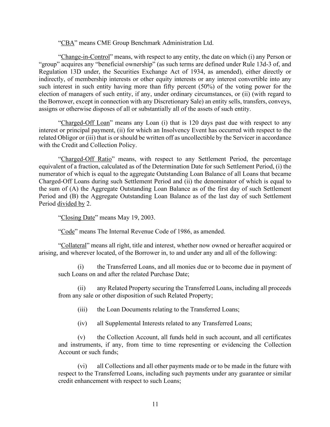 11 “CBA” means CME Group Benchmark Administration Ltd. “Change-in-Control” means, with respect to any entity, the date on which (i) any Person or “group” acquires any “beneficial ownership” (as such terms are defined under Rule 13d-3 of, and Regulation 13D under, the Securities Exchange Act of 1934, as amended), either directly or indirectly, of membership interests or other equity interests or any interest convertible into any such interest in such entity having more than fifty percent (50%) of the voting power for the election of managers of such entity, if any, under ordinary circumstances, or (ii) (with regard to the Borrower, except in connection with any Discretionary Sale) an entity sells, transfers, conveys, assigns or otherwise disposes of all or substantially all of the assets of such entity. “Charged-Off Loan” means any Loan (i) that is 120 days past due with respect to any interest or principal payment, (ii) for which an Insolvency Event has occurred with respect to the related Obligor or (iii) that is or should be written off as uncollectible by the Servicer in accordance with the Credit and Collection Policy. “Charged-Off Ratio” means, with respect to any Settlement Period, the percentage equivalent of a fraction, calculated as of the Determination Date for such Settlement Period, (i) the numerator of which is equal to the aggregate Outstanding Loan Balance of all Loans that became Charged-Off Loans during such Settlement Period and (ii) the denominator of which is equal to the sum of (A) the Aggregate Outstanding Loan Balance as of the first day of such Settlement Period and (B) the Aggregate Outstanding Loan Balance as of the last day of such Settlement Period divided by 2. “Closing Date” means May 19, 2003. “Code” means The Internal Revenue Code of 1986, as amended. “Collateral” means all right, title and interest, whether now owned or hereafter acquired or arising, and wherever located, of the Borrower in, to and under any and all of the following: (i) the Transferred Loans, and all monies due or to become due in payment of such Loans on and after the related Purchase Date; (ii) any Related Property securing the Transferred Loans, including all proceeds from any sale or other disposition of such Related Property; (iii) the Loan Documents relating to the Transferred Loans; (iv) all Supplemental Interests related to any Transferred Loans; (v) the Collection Account, all funds held in such account, and all certificates and instruments, if any, from time to time representing or evidencing the Collection Account or such funds; (vi) all Collections and all other payments made or to be made in the future with respect to the Transferred Loans, including such payments under any guarantee or similar credit enhancement with respect to such Loans;