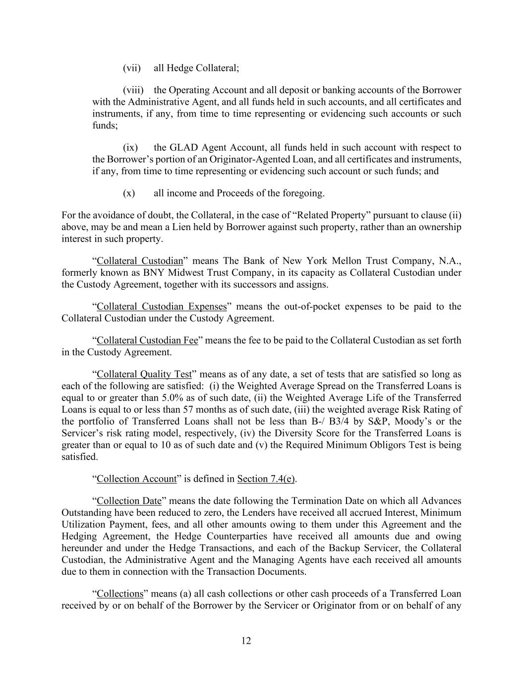 12 (vii) all Hedge Collateral; (viii) the Operating Account and all deposit or banking accounts of the Borrower with the Administrative Agent, and all funds held in such accounts, and all certificates and instruments, if any, from time to time representing or evidencing such accounts or such funds; (ix) the GLAD Agent Account, all funds held in such account with respect to the Borrower’s portion of an Originator-Agented Loan, and all certificates and instruments, if any, from time to time representing or evidencing such account or such funds; and (x) all income and Proceeds of the foregoing. For the avoidance of doubt, the Collateral, in the case of “Related Property” pursuant to clause (ii) above, may be and mean a Lien held by Borrower against such property, rather than an ownership interest in such property. “Collateral Custodian” means The Bank of New York Mellon Trust Company, N.A., formerly known as BNY Midwest Trust Company, in its capacity as Collateral Custodian under the Custody Agreement, together with its successors and assigns. “Collateral Custodian Expenses” means the out-of-pocket expenses to be paid to the Collateral Custodian under the Custody Agreement. “Collateral Custodian Fee” means the fee to be paid to the Collateral Custodian as set forth in the Custody Agreement. “Collateral Quality Test” means as of any date, a set of tests that are satisfied so long as each of the following are satisfied: (i) the Weighted Average Spread on the Transferred Loans is equal to or greater than 5.0% as of such date, (ii) the Weighted Average Life of the Transferred Loans is equal to or less than 57 months as of such date, (iii) the weighted average Risk Rating of the portfolio of Transferred Loans shall not be less than B-/ B3/4 by S&P, Moody’s or the Servicer’s risk rating model, respectively, (iv) the Diversity Score for the Transferred Loans is greater than or equal to 10 as of such date and (v) the Required Minimum Obligors Test is being satisfied. “Collection Account” is defined in Section 7.4(e). “Collection Date” means the date following the Termination Date on which all Advances Outstanding have been reduced to zero, the Lenders have received all accrued Interest, Minimum Utilization Payment, fees, and all other amounts owing to them under this Agreement and the Hedging Agreement, the Hedge Counterparties have received all amounts due and owing hereunder and under the Hedge Transactions, and each of the Backup Servicer, the Collateral Custodian, the Administrative Agent and the Managing Agents have each received all amounts due to them in connection with the Transaction Documents. “Collections” means (a) all cash collections or other cash proceeds of a Transferred Loan received by or on behalf of the Borrower by the Servicer or Originator from or on behalf of any