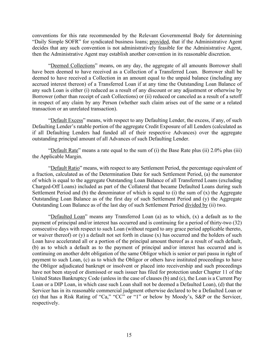 15 conventions for this rate recommended by the Relevant Governmental Body for determining “Daily Simple SOFR” for syndicated business loans; provided, that if the Administrative Agent decides that any such convention is not administratively feasible for the Administrative Agent, then the Administrative Agent may establish another convention in its reasonable discretion. “Deemed Collections” means, on any day, the aggregate of all amounts Borrower shall have been deemed to have received as a Collection of a Transferred Loan. Borrower shall be deemed to have received a Collection in an amount equal to the unpaid balance (including any accrued interest thereon) of a Transferred Loan if at any time the Outstanding Loan Balance of any such Loan is either (i) reduced as a result of any discount or any adjustment or otherwise by Borrower (other than receipt of cash Collections) or (ii) reduced or canceled as a result of a setoff in respect of any claim by any Person (whether such claim arises out of the same or a related transaction or an unrelated transaction). “Default Excess” means, with respect to any Defaulting Lender, the excess, if any, of such Defaulting Lender’s ratable portion of the aggregate Credit Exposure of all Lenders (calculated as if all Defaulting Lenders had funded all of their respective Advances) over the aggregate outstanding principal amount of all Advances of such Defaulting Lender. “Default Rate” means a rate equal to the sum of (i) the Base Rate plus (ii) 2.0% plus (iii) the Applicable Margin. “Default Ratio” means, with respect to any Settlement Period, the percentage equivalent of a fraction, calculated as of the Determination Date for such Settlement Period, (a) the numerator of which is equal to the aggregate Outstanding Loan Balance of all Transferred Loans (excluding Charged-Off Loans) included as part of the Collateral that became Defaulted Loans during such Settlement Period and (b) the denominator of which is equal to (i) the sum of (x) the Aggregate Outstanding Loan Balance as of the first day of such Settlement Period and (y) the Aggregate Outstanding Loan Balance as of the last day of such Settlement Period divided by (ii) two. “Defaulted Loan” means any Transferred Loan (a) as to which, (x) a default as to the payment of principal and/or interest has occurred and is continuing for a period of thirty-two (32) consecutive days with respect to such Loan (without regard to any grace period applicable thereto, or waiver thereof) or (y) a default not set forth in clause (x) has occurred and the holders of such Loan have accelerated all or a portion of the principal amount thereof as a result of such default, (b) as to which a default as to the payment of principal and/or interest has occurred and is continuing on another debt obligation of the same Obligor which is senior or pari passu in right of payment to such Loan, (c) as to which the Obligor or others have instituted proceedings to have the Obligor adjudicated bankrupt or insolvent or placed into receivership and such proceedings have not been stayed or dismissed or such issuer has filed for protection under Chapter 11 of the United States Bankruptcy Code (unless in the case of clauses (b) and (c), the Loan is a Current Pay Loan or a DIP Loan, in which case such Loan shall not be deemed a Defaulted Loan), (d) that the Servicer has in its reasonable commercial judgment otherwise declared to be a Defaulted Loan or (e) that has a Risk Rating of “Ca,” “CC” or “1” or below by Moody’s, S&P or the Servicer, respectively.