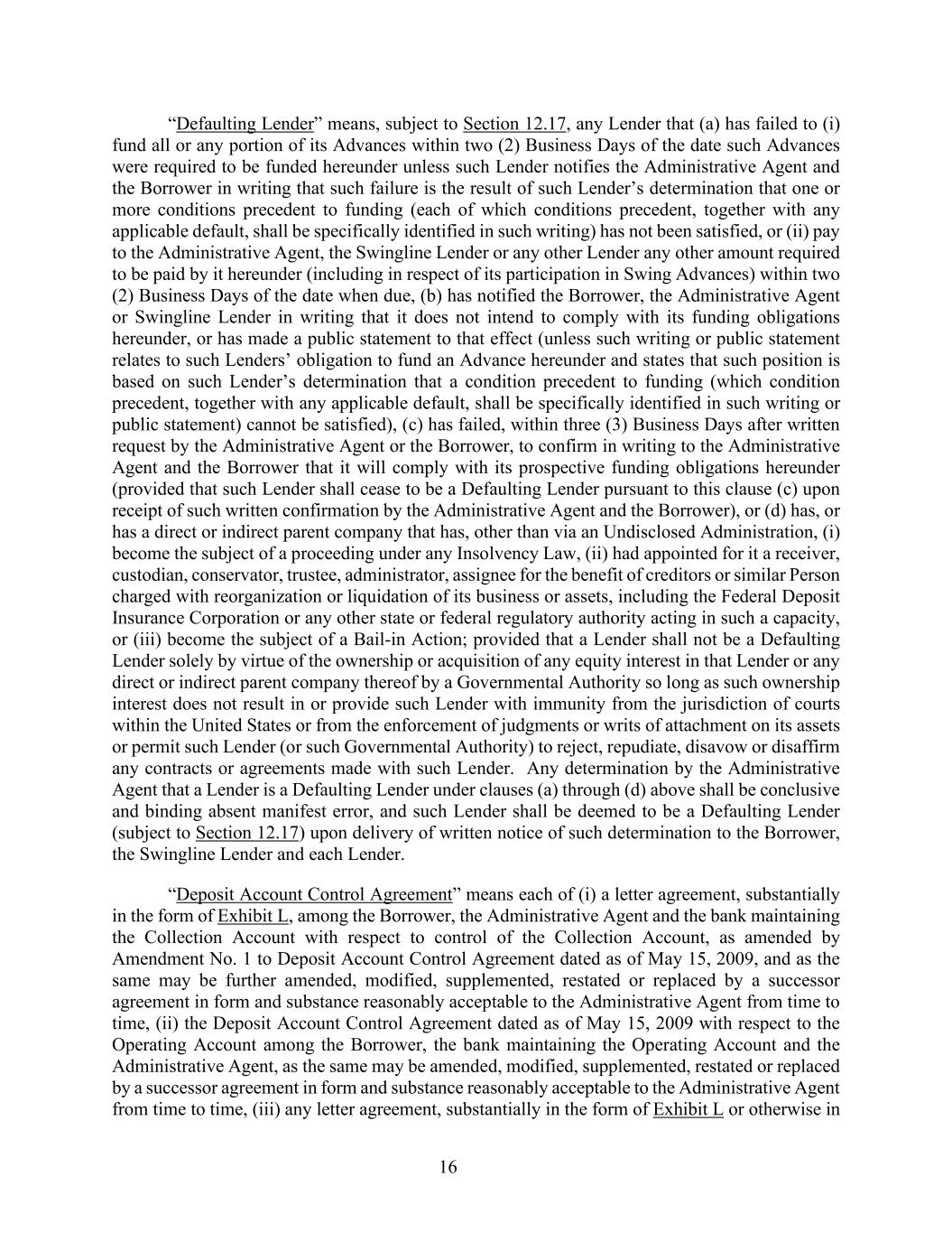 16 “Defaulting Lender” means, subject to Section 12.17, any Lender that (a) has failed to (i) fund all or any portion of its Advances within two (2) Business Days of the date such Advances were required to be funded hereunder unless such Lender notifies the Administrative Agent and the Borrower in writing that such failure is the result of such Lender’s determination that one or more conditions precedent to funding (each of which conditions precedent, together with any applicable default, shall be specifically identified in such writing) has not been satisfied, or (ii) pay to the Administrative Agent, the Swingline Lender or any other Lender any other amount required to be paid by it hereunder (including in respect of its participation in Swing Advances) within two (2) Business Days of the date when due, (b) has notified the Borrower, the Administrative Agent or Swingline Lender in writing that it does not intend to comply with its funding obligations hereunder, or has made a public statement to that effect (unless such writing or public statement relates to such Lenders’ obligation to fund an Advance hereunder and states that such position is based on such Lender’s determination that a condition precedent to funding (which condition precedent, together with any applicable default, shall be specifically identified in such writing or public statement) cannot be satisfied), (c) has failed, within three (3) Business Days after written request by the Administrative Agent or the Borrower, to confirm in writing to the Administrative Agent and the Borrower that it will comply with its prospective funding obligations hereunder (provided that such Lender shall cease to be a Defaulting Lender pursuant to this clause (c) upon receipt of such written confirmation by the Administrative Agent and the Borrower), or (d) has, or has a direct or indirect parent company that has, other than via an Undisclosed Administration, (i) become the subject of a proceeding under any Insolvency Law, (ii) had appointed for it a receiver, custodian, conservator, trustee, administrator, assignee for the benefit of creditors or similar Person charged with reorganization or liquidation of its business or assets, including the Federal Deposit Insurance Corporation or any other state or federal regulatory authority acting in such a capacity, or (iii) become the subject of a Bail-in Action; provided that a Lender shall not be a Defaulting Lender solely by virtue of the ownership or acquisition of any equity interest in that Lender or any direct or indirect parent company thereof by a Governmental Authority so long as such ownership interest does not result in or provide such Lender with immunity from the jurisdiction of courts within the United States or from the enforcement of judgments or writs of attachment on its assets or permit such Lender (or such Governmental Authority) to reject, repudiate, disavow or disaffirm any contracts or agreements made with such Lender. Any determination by the Administrative Agent that a Lender is a Defaulting Lender under clauses (a) through (d) above shall be conclusive and binding absent manifest error, and such Lender shall be deemed to be a Defaulting Lender (subject to Section 12.17) upon delivery of written notice of such determination to the Borrower, the Swingline Lender and each Lender. “Deposit Account Control Agreement” means each of (i) a letter agreement, substantially in the form of Exhibit L, among the Borrower, the Administrative Agent and the bank maintaining the Collection Account with respect to control of the Collection Account, as amended by Amendment No. 1 to Deposit Account Control Agreement dated as of May 15, 2009, and as the same may be further amended, modified, supplemented, restated or replaced by a successor agreement in form and substance reasonably acceptable to the Administrative Agent from time to time, (ii) the Deposit Account Control Agreement dated as of May 15, 2009 with respect to the Operating Account among the Borrower, the bank maintaining the Operating Account and the Administrative Agent, as the same may be amended, modified, supplemented, restated or replaced by a successor agreement in form and substance reasonably acceptable to the Administrative Agent from time to time, (iii) any letter agreement, substantially in the form of Exhibit L or otherwise in