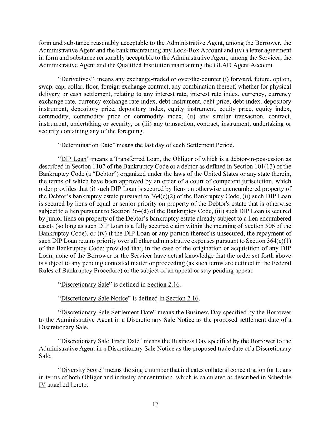 17 form and substance reasonably acceptable to the Administrative Agent, among the Borrower, the Administrative Agent and the bank maintaining any Lock-Box Account and (iv) a letter agreement in form and substance reasonably acceptable to the Administrative Agent, among the Servicer, the Administrative Agent and the Qualified Institution maintaining the GLAD Agent Account. “Derivatives” means any exchange-traded or over-the-counter (i) forward, future, option, swap, cap, collar, floor, foreign exchange contract, any combination thereof, whether for physical delivery or cash settlement, relating to any interest rate, interest rate index, currency, currency exchange rate, currency exchange rate index, debt instrument, debt price, debt index, depository instrument, depository price, depository index, equity instrument, equity price, equity index, commodity, commodity price or commodity index, (ii) any similar transaction, contract, instrument, undertaking or security, or (iii) any transaction, contract, instrument, undertaking or security containing any of the foregoing. “Determination Date” means the last day of each Settlement Period. “DIP Loan” means a Transferred Loan, the Obligor of which is a debtor-in-possession as described in Section 1107 of the Bankruptcy Code or a debtor as defined in Section 101(13) of the Bankruptcy Code (a “Debtor”) organized under the laws of the United States or any state therein, the terms of which have been approved by an order of a court of competent jurisdiction, which order provides that (i) such DIP Loan is secured by liens on otherwise unencumbered property of the Debtor’s bankruptcy estate pursuant to 364(c)(2) of the Bankruptcy Code, (ii) such DIP Loan is secured by liens of equal or senior priority on property of the Debtor's estate that is otherwise subject to a lien pursuant to Section 364(d) of the Bankruptcy Code, (iii) such DIP Loan is secured by junior liens on property of the Debtor’s bankruptcy estate already subject to a lien encumbered assets (so long as such DIP Loan is a fully secured claim within the meaning of Section 506 of the Bankruptcy Code), or (iv) if the DIP Loan or any portion thereof is unsecured, the repayment of such DIP Loan retains priority over all other administrative expenses pursuant to Section 364(c)(1) of the Bankruptcy Code; provided that, in the case of the origination or acquisition of any DIP Loan, none of the Borrower or the Servicer have actual knowledge that the order set forth above is subject to any pending contested matter or proceeding (as such terms are defined in the Federal Rules of Bankruptcy Procedure) or the subject of an appeal or stay pending appeal. “Discretionary Sale” is defined in Section 2.16. “Discretionary Sale Notice” is defined in Section 2.16. “Discretionary Sale Settlement Date” means the Business Day specified by the Borrower to the Administrative Agent in a Discretionary Sale Notice as the proposed settlement date of a Discretionary Sale. “Discretionary Sale Trade Date” means the Business Day specified by the Borrower to the Administrative Agent in a Discretionary Sale Notice as the proposed trade date of a Discretionary Sale. “Diversity Score” means the single number that indicates collateral concentration for Loans in terms of both Obligor and industry concentration, which is calculated as described in Schedule IV attached hereto.
