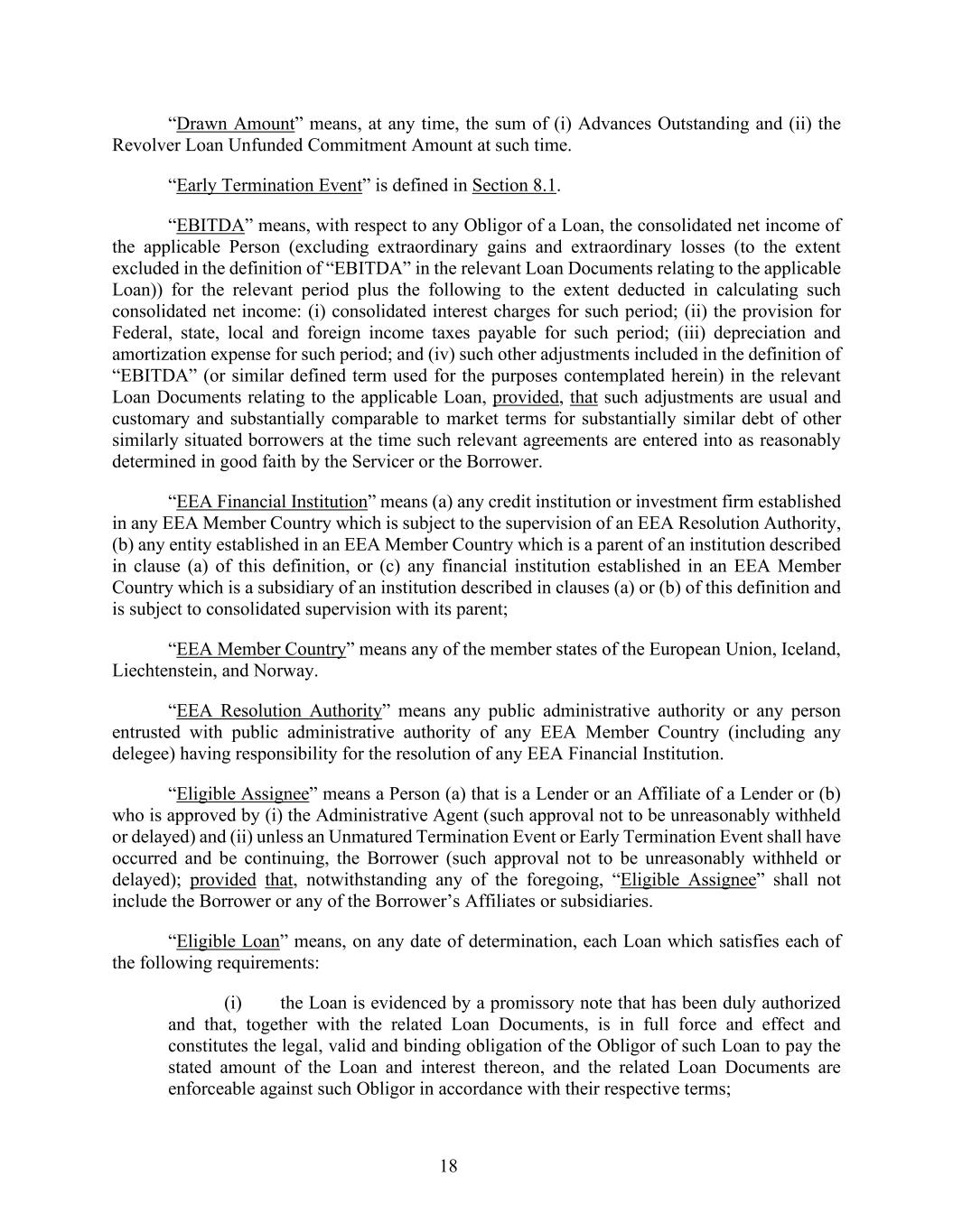 18 “Drawn Amount” means, at any time, the sum of (i) Advances Outstanding and (ii) the Revolver Loan Unfunded Commitment Amount at such time. “Early Termination Event” is defined in Section 8.1. “EBITDA” means, with respect to any Obligor of a Loan, the consolidated net income of the applicable Person (excluding extraordinary gains and extraordinary losses (to the extent excluded in the definition of “EBITDA” in the relevant Loan Documents relating to the applicable Loan)) for the relevant period plus the following to the extent deducted in calculating such consolidated net income: (i) consolidated interest charges for such period; (ii) the provision for Federal, state, local and foreign income taxes payable for such period; (iii) depreciation and amortization expense for such period; and (iv) such other adjustments included in the definition of “EBITDA” (or similar defined term used for the purposes contemplated herein) in the relevant Loan Documents relating to the applicable Loan, provided, that such adjustments are usual and customary and substantially comparable to market terms for substantially similar debt of other similarly situated borrowers at the time such relevant agreements are entered into as reasonably determined in good faith by the Servicer or the Borrower. “EEA Financial Institution” means (a) any credit institution or investment firm established in any EEA Member Country which is subject to the supervision of an EEA Resolution Authority, (b) any entity established in an EEA Member Country which is a parent of an institution described in clause (a) of this definition, or (c) any financial institution established in an EEA Member Country which is a subsidiary of an institution described in clauses (a) or (b) of this definition and is subject to consolidated supervision with its parent; “EEA Member Country” means any of the member states of the European Union, Iceland, Liechtenstein, and Norway. “EEA Resolution Authority” means any public administrative authority or any person entrusted with public administrative authority of any EEA Member Country (including any delegee) having responsibility for the resolution of any EEA Financial Institution. “Eligible Assignee” means a Person (a) that is a Lender or an Affiliate of a Lender or (b) who is approved by (i) the Administrative Agent (such approval not to be unreasonably withheld or delayed) and (ii) unless an Unmatured Termination Event or Early Termination Event shall have occurred and be continuing, the Borrower (such approval not to be unreasonably withheld or delayed); provided that, notwithstanding any of the foregoing, “Eligible Assignee” shall not include the Borrower or any of the Borrower’s Affiliates or subsidiaries. “Eligible Loan” means, on any date of determination, each Loan which satisfies each of the following requirements: (i) the Loan is evidenced by a promissory note that has been duly authorized and that, together with the related Loan Documents, is in full force and effect and constitutes the legal, valid and binding obligation of the Obligor of such Loan to pay the stated amount of the Loan and interest thereon, and the related Loan Documents are enforceable against such Obligor in accordance with their respective terms;