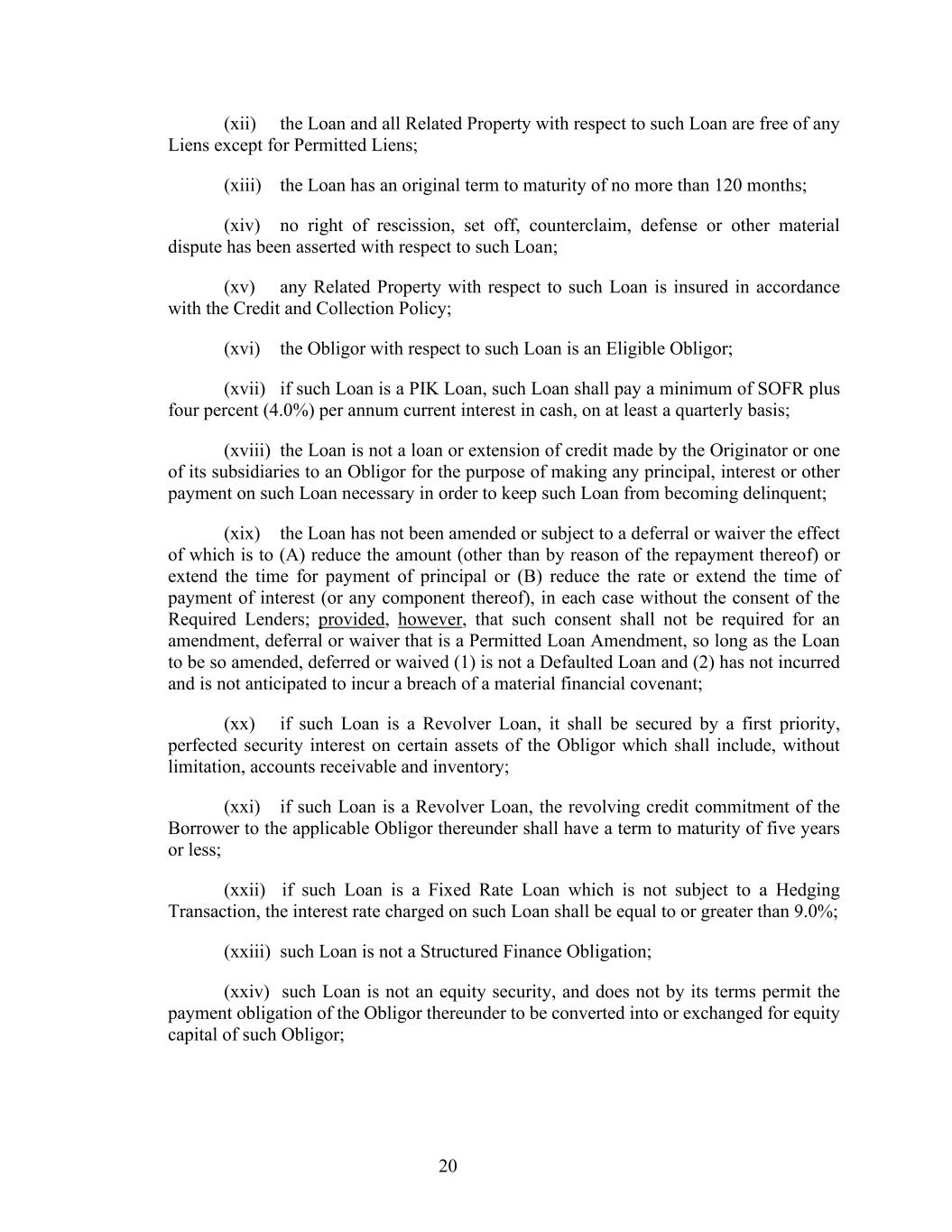 20 (xii) the Loan and all Related Property with respect to such Loan are free of any Liens except for Permitted Liens; (xiii) the Loan has an original term to maturity of no more than 120 months; (xiv) no right of rescission, set off, counterclaim, defense or other material dispute has been asserted with respect to such Loan; (xv) any Related Property with respect to such Loan is insured in accordance with the Credit and Collection Policy; (xvi) the Obligor with respect to such Loan is an Eligible Obligor; (xvii) if such Loan is a PIK Loan, such Loan shall pay a minimum of SOFR plus four percent (4.0%) per annum current interest in cash, on at least a quarterly basis; (xviii) the Loan is not a loan or extension of credit made by the Originator or one of its subsidiaries to an Obligor for the purpose of making any principal, interest or other payment on such Loan necessary in order to keep such Loan from becoming delinquent; (xix) the Loan has not been amended or subject to a deferral or waiver the effect of which is to (A) reduce the amount (other than by reason of the repayment thereof) or extend the time for payment of principal or (B) reduce the rate or extend the time of payment of interest (or any component thereof), in each case without the consent of the Required Lenders; provided, however, that such consent shall not be required for an amendment, deferral or waiver that is a Permitted Loan Amendment, so long as the Loan to be so amended, deferred or waived (1) is not a Defaulted Loan and (2) has not incurred and is not anticipated to incur a breach of a material financial covenant; (xx) if such Loan is a Revolver Loan, it shall be secured by a first priority, perfected security interest on certain assets of the Obligor which shall include, without limitation, accounts receivable and inventory; (xxi) if such Loan is a Revolver Loan, the revolving credit commitment of the Borrower to the applicable Obligor thereunder shall have a term to maturity of five years or less; (xxii) if such Loan is a Fixed Rate Loan which is not subject to a Hedging Transaction, the interest rate charged on such Loan shall be equal to or greater than 9.0%; (xxiii) such Loan is not a Structured Finance Obligation; (xxiv) such Loan is not an equity security, and does not by its terms permit the payment obligation of the Obligor thereunder to be converted into or exchanged for equity capital of such Obligor;