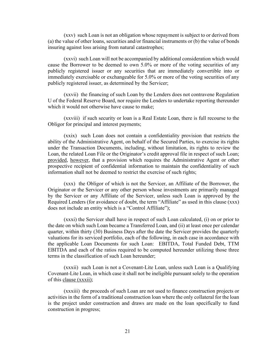 21 (xxv) such Loan is not an obligation whose repayment is subject to or derived from (a) the value of other loans, securities and/or financial instruments or (b) the value of bonds insuring against loss arising from natural catastrophes; (xxvi) such Loan will not be accompanied by additional consideration which would cause the Borrower to be deemed to own 5.0% or more of the voting securities of any publicly registered issuer or any securities that are immediately convertible into or immediately exercisable or exchangeable for 5.0% or more of the voting securities of any publicly registered issuer, as determined by the Servicer; (xxvii) the financing of such Loan by the Lenders does not contravene Regulation U of the Federal Reserve Board, nor require the Lenders to undertake reporting thereunder which it would not otherwise have cause to make; (xxviii) if such security or loan is a Real Estate Loan, there is full recourse to the Obligor for principal and interest payments; (xxix) such Loan does not contain a confidentiality provision that restricts the ability of the Administrative Agent, on behalf of the Secured Parties, to exercise its rights under the Transaction Documents, including, without limitation, its rights to review the Loan, the related Loan File or the Originator’s credit approval file in respect of such Loan; provided, however, that a provision which requires the Administrative Agent or other prospective recipient of confidential information to maintain the confidentiality of such information shall not be deemed to restrict the exercise of such rights; (xxx) the Obligor of which is not the Servicer, an Affiliate of the Borrower, the Originator or the Servicer or any other person whose investments are primarily managed by the Servicer or any Affiliate of the Servicer, unless such Loan is approved by the Required Lenders (for avoidance of doubt, the term “Affiliate” as used in this clause (xxx) does not include an entity which is a “Control Affiliate”); (xxxi) the Servicer shall have in respect of such Loan calculated, (i) on or prior to the date on which such Loan became a Transferred Loan, and (ii) at least once per calendar quarter, within thirty (30) Business Days after the date the Servicer provides the quarterly valuations for its serviced portfolio, each of the following, in each case in accordance with the applicable Loan Documents for such Loan: EBITDA, Total Funded Debt, TTM EBITDA and each of the ratios required to be computed hereunder utilizing those three terms in the classification of such Loan hereunder; (xxxii) such Loan is not a Covenant-Lite Loan, unless such Loan is a Qualifying Covenant-Lite Loan, in which case it shall not be ineligible pursuant solely to the operation of this clause (xxxii); (xxxiii) the proceeds of such Loan are not used to finance construction projects or activities in the form of a traditional construction loan where the only collateral for the loan is the project under construction and draws are made on the loan specifically to fund construction in progress;