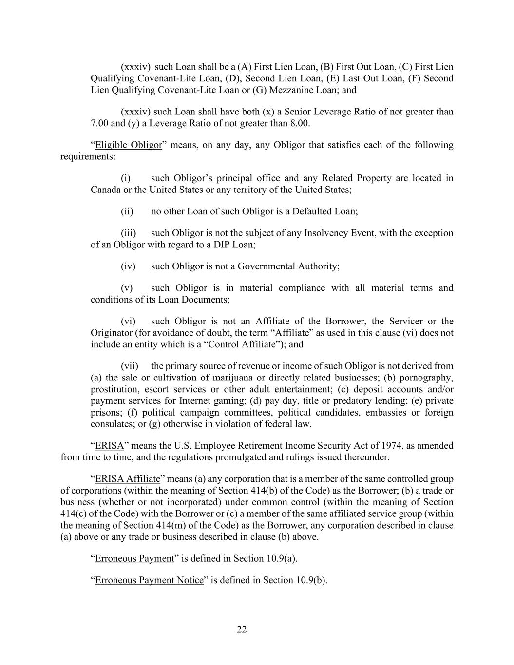 22 (xxxiv) such Loan shall be a (A) First Lien Loan, (B) First Out Loan, (C) First Lien Qualifying Covenant-Lite Loan, (D), Second Lien Loan, (E) Last Out Loan, (F) Second Lien Qualifying Covenant-Lite Loan or (G) Mezzanine Loan; and (xxxiv) such Loan shall have both (x) a Senior Leverage Ratio of not greater than 7.00 and (y) a Leverage Ratio of not greater than 8.00. “Eligible Obligor” means, on any day, any Obligor that satisfies each of the following requirements: (i) such Obligor’s principal office and any Related Property are located in Canada or the United States or any territory of the United States; (ii) no other Loan of such Obligor is a Defaulted Loan; (iii) such Obligor is not the subject of any Insolvency Event, with the exception of an Obligor with regard to a DIP Loan; (iv) such Obligor is not a Governmental Authority; (v) such Obligor is in material compliance with all material terms and conditions of its Loan Documents; (vi) such Obligor is not an Affiliate of the Borrower, the Servicer or the Originator (for avoidance of doubt, the term “Affiliate” as used in this clause (vi) does not include an entity which is a “Control Affiliate”); and (vii) the primary source of revenue or income of such Obligor is not derived from (a) the sale or cultivation of marijuana or directly related businesses; (b) pornography, prostitution, escort services or other adult entertainment; (c) deposit accounts and/or payment services for Internet gaming; (d) pay day, title or predatory lending; (e) private prisons; (f) political campaign committees, political candidates, embassies or foreign consulates; or (g) otherwise in violation of federal law. “ERISA” means the U.S. Employee Retirement Income Security Act of 1974, as amended from time to time, and the regulations promulgated and rulings issued thereunder. “ERISA Affiliate” means (a) any corporation that is a member of the same controlled group of corporations (within the meaning of Section 414(b) of the Code) as the Borrower; (b) a trade or business (whether or not incorporated) under common control (within the meaning of Section 414(c) of the Code) with the Borrower or (c) a member of the same affiliated service group (within the meaning of Section 414(m) of the Code) as the Borrower, any corporation described in clause (a) above or any trade or business described in clause (b) above. “Erroneous Payment” is defined in Section 10.9(a). “Erroneous Payment Notice” is defined in Section 10.9(b).