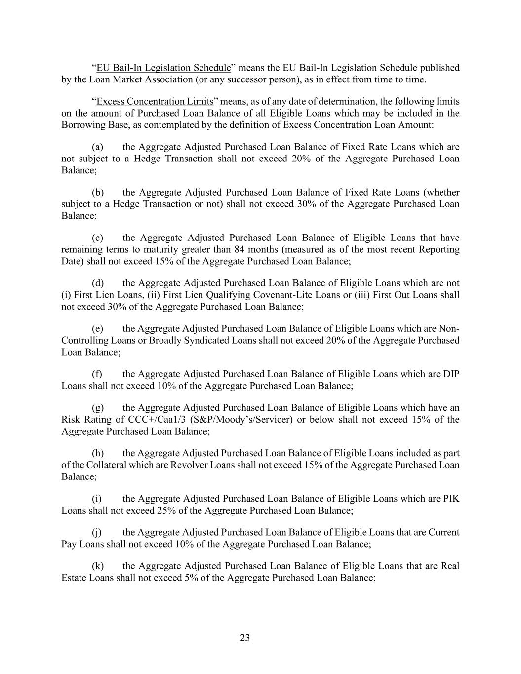 23 “EU Bail-In Legislation Schedule” means the EU Bail-In Legislation Schedule published by the Loan Market Association (or any successor person), as in effect from time to time. “Excess Concentration Limits” means, as of any date of determination, the following limits on the amount of Purchased Loan Balance of all Eligible Loans which may be included in the Borrowing Base, as contemplated by the definition of Excess Concentration Loan Amount: (a) the Aggregate Adjusted Purchased Loan Balance of Fixed Rate Loans which are not subject to a Hedge Transaction shall not exceed 20% of the Aggregate Purchased Loan Balance; (b) the Aggregate Adjusted Purchased Loan Balance of Fixed Rate Loans (whether subject to a Hedge Transaction or not) shall not exceed 30% of the Aggregate Purchased Loan Balance; (c) the Aggregate Adjusted Purchased Loan Balance of Eligible Loans that have remaining terms to maturity greater than 84 months (measured as of the most recent Reporting Date) shall not exceed 15% of the Aggregate Purchased Loan Balance; (d) the Aggregate Adjusted Purchased Loan Balance of Eligible Loans which are not (i) First Lien Loans, (ii) First Lien Qualifying Covenant-Lite Loans or (iii) First Out Loans shall not exceed 30% of the Aggregate Purchased Loan Balance; (e) the Aggregate Adjusted Purchased Loan Balance of Eligible Loans which are Non- Controlling Loans or Broadly Syndicated Loans shall not exceed 20% of the Aggregate Purchased Loan Balance; (f) the Aggregate Adjusted Purchased Loan Balance of Eligible Loans which are DIP Loans shall not exceed 10% of the Aggregate Purchased Loan Balance; (g) the Aggregate Adjusted Purchased Loan Balance of Eligible Loans which have an Risk Rating of CCC+/Caa1/3 (S&P/Moody’s/Servicer) or below shall not exceed 15% of the Aggregate Purchased Loan Balance; (h) the Aggregate Adjusted Purchased Loan Balance of Eligible Loans included as part of the Collateral which are Revolver Loans shall not exceed 15% of the Aggregate Purchased Loan Balance; (i) the Aggregate Adjusted Purchased Loan Balance of Eligible Loans which are PIK Loans shall not exceed 25% of the Aggregate Purchased Loan Balance; (j) the Aggregate Adjusted Purchased Loan Balance of Eligible Loans that are Current Pay Loans shall not exceed 10% of the Aggregate Purchased Loan Balance; (k) the Aggregate Adjusted Purchased Loan Balance of Eligible Loans that are Real Estate Loans shall not exceed 5% of the Aggregate Purchased Loan Balance;