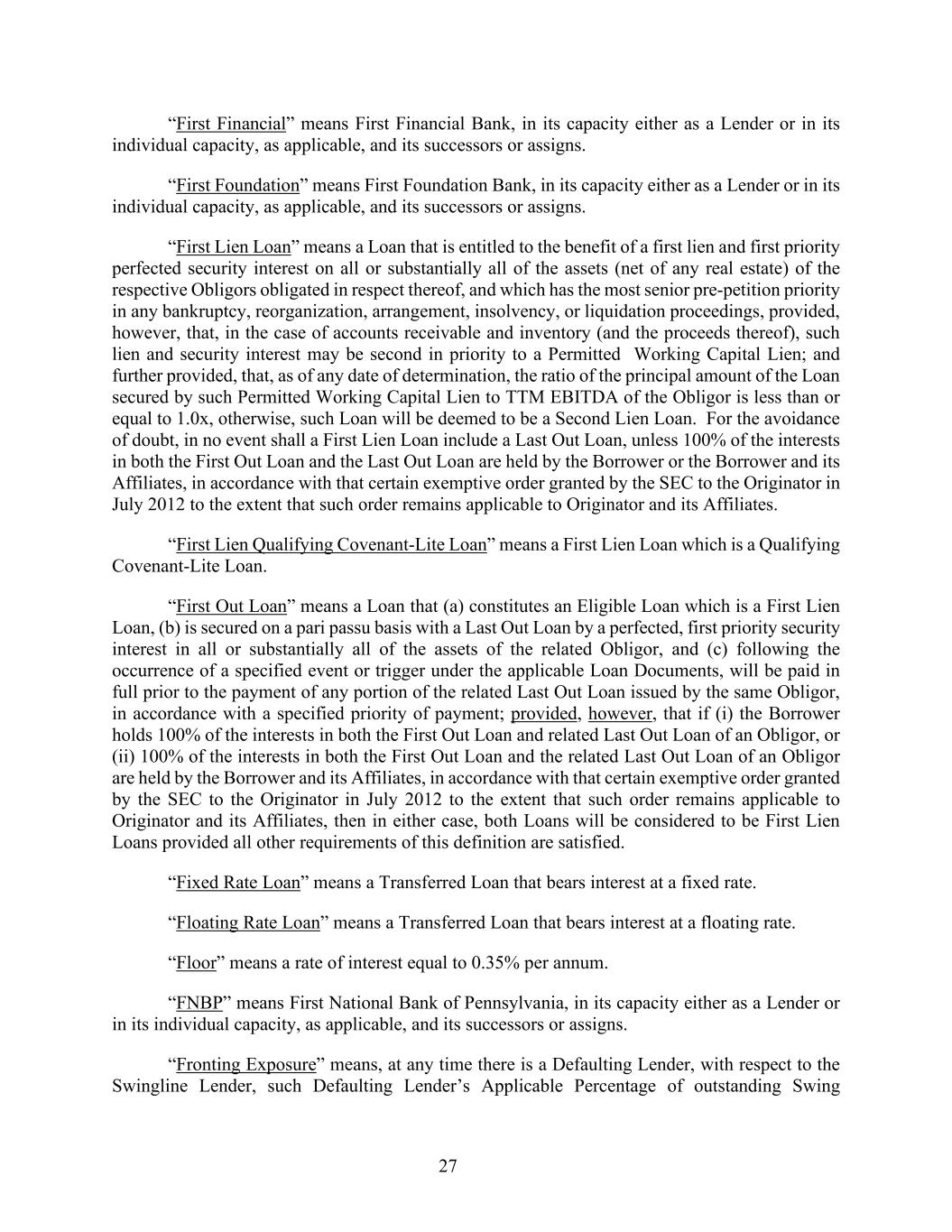 27 “First Financial” means First Financial Bank, in its capacity either as a Lender or in its individual capacity, as applicable, and its successors or assigns. “First Foundation” means First Foundation Bank, in its capacity either as a Lender or in its individual capacity, as applicable, and its successors or assigns. “First Lien Loan” means a Loan that is entitled to the benefit of a first lien and first priority perfected security interest on all or substantially all of the assets (net of any real estate) of the respective Obligors obligated in respect thereof, and which has the most senior pre-petition priority in any bankruptcy, reorganization, arrangement, insolvency, or liquidation proceedings, provided, however, that, in the case of accounts receivable and inventory (and the proceeds thereof), such lien and security interest may be second in priority to a Permitted Working Capital Lien; and further provided, that, as of any date of determination, the ratio of the principal amount of the Loan secured by such Permitted Working Capital Lien to TTM EBITDA of the Obligor is less than or equal to 1.0x, otherwise, such Loan will be deemed to be a Second Lien Loan. For the avoidance of doubt, in no event shall a First Lien Loan include a Last Out Loan, unless 100% of the interests in both the First Out Loan and the Last Out Loan are held by the Borrower or the Borrower and its Affiliates, in accordance with that certain exemptive order granted by the SEC to the Originator in July 2012 to the extent that such order remains applicable to Originator and its Affiliates. “First Lien Qualifying Covenant-Lite Loan” means a First Lien Loan which is a Qualifying Covenant-Lite Loan. “First Out Loan” means a Loan that (a) constitutes an Eligible Loan which is a First Lien Loan, (b) is secured on a pari passu basis with a Last Out Loan by a perfected, first priority security interest in all or substantially all of the assets of the related Obligor, and (c) following the occurrence of a specified event or trigger under the applicable Loan Documents, will be paid in full prior to the payment of any portion of the related Last Out Loan issued by the same Obligor, in accordance with a specified priority of payment; provided, however, that if (i) the Borrower holds 100% of the interests in both the First Out Loan and related Last Out Loan of an Obligor, or (ii) 100% of the interests in both the First Out Loan and the related Last Out Loan of an Obligor are held by the Borrower and its Affiliates, in accordance with that certain exemptive order granted by the SEC to the Originator in July 2012 to the extent that such order remains applicable to Originator and its Affiliates, then in either case, both Loans will be considered to be First Lien Loans provided all other requirements of this definition are satisfied. “Fixed Rate Loan” means a Transferred Loan that bears interest at a fixed rate. “Floating Rate Loan” means a Transferred Loan that bears interest at a floating rate. “Floor” means a rate of interest equal to 0.35% per annum. “FNBP” means First National Bank of Pennsylvania, in its capacity either as a Lender or in its individual capacity, as applicable, and its successors or assigns. “Fronting Exposure” means, at any time there is a Defaulting Lender, with respect to the Swingline Lender, such Defaulting Lender’s Applicable Percentage of outstanding Swing