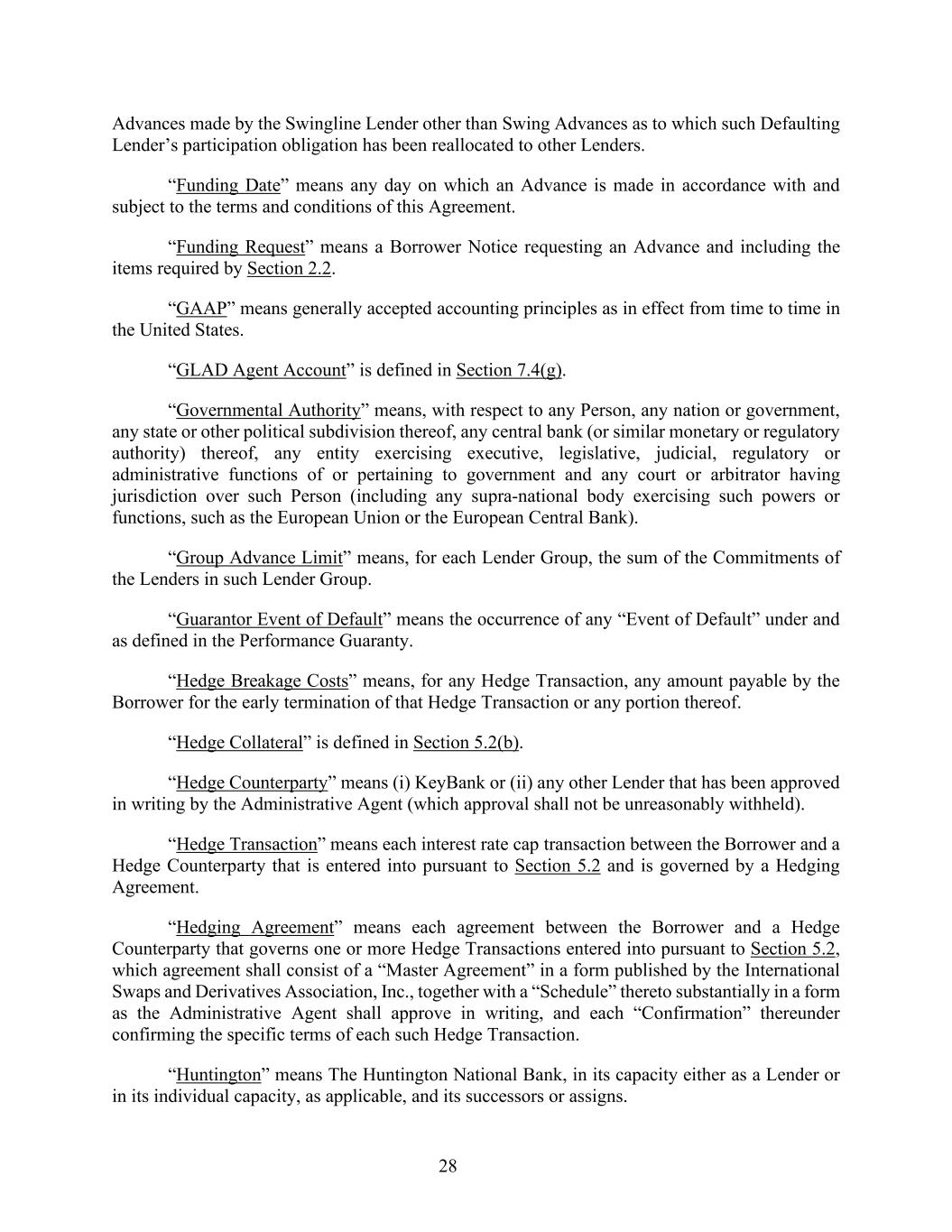 28 Advances made by the Swingline Lender other than Swing Advances as to which such Defaulting Lender’s participation obligation has been reallocated to other Lenders. “Funding Date” means any day on which an Advance is made in accordance with and subject to the terms and conditions of this Agreement. “Funding Request” means a Borrower Notice requesting an Advance and including the items required by Section 2.2. “GAAP” means generally accepted accounting principles as in effect from time to time in the United States. “GLAD Agent Account” is defined in Section 7.4(g). “Governmental Authority” means, with respect to any Person, any nation or government, any state or other political subdivision thereof, any central bank (or similar monetary or regulatory authority) thereof, any entity exercising executive, legislative, judicial, regulatory or administrative functions of or pertaining to government and any court or arbitrator having jurisdiction over such Person (including any supra-national body exercising such powers or functions, such as the European Union or the European Central Bank). “Group Advance Limit” means, for each Lender Group, the sum of the Commitments of the Lenders in such Lender Group. “Guarantor Event of Default” means the occurrence of any “Event of Default” under and as defined in the Performance Guaranty. “Hedge Breakage Costs” means, for any Hedge Transaction, any amount payable by the Borrower for the early termination of that Hedge Transaction or any portion thereof. “Hedge Collateral” is defined in Section 5.2(b). “Hedge Counterparty” means (i) KeyBank or (ii) any other Lender that has been approved in writing by the Administrative Agent (which approval shall not be unreasonably withheld). “Hedge Transaction” means each interest rate cap transaction between the Borrower and a Hedge Counterparty that is entered into pursuant to Section 5.2 and is governed by a Hedging Agreement. “Hedging Agreement” means each agreement between the Borrower and a Hedge Counterparty that governs one or more Hedge Transactions entered into pursuant to Section 5.2, which agreement shall consist of a “Master Agreement” in a form published by the International Swaps and Derivatives Association, Inc., together with a “Schedule” thereto substantially in a form as the Administrative Agent shall approve in writing, and each “Confirmation” thereunder confirming the specific terms of each such Hedge Transaction. “Huntington” means The Huntington National Bank, in its capacity either as a Lender or in its individual capacity, as applicable, and its successors or assigns.