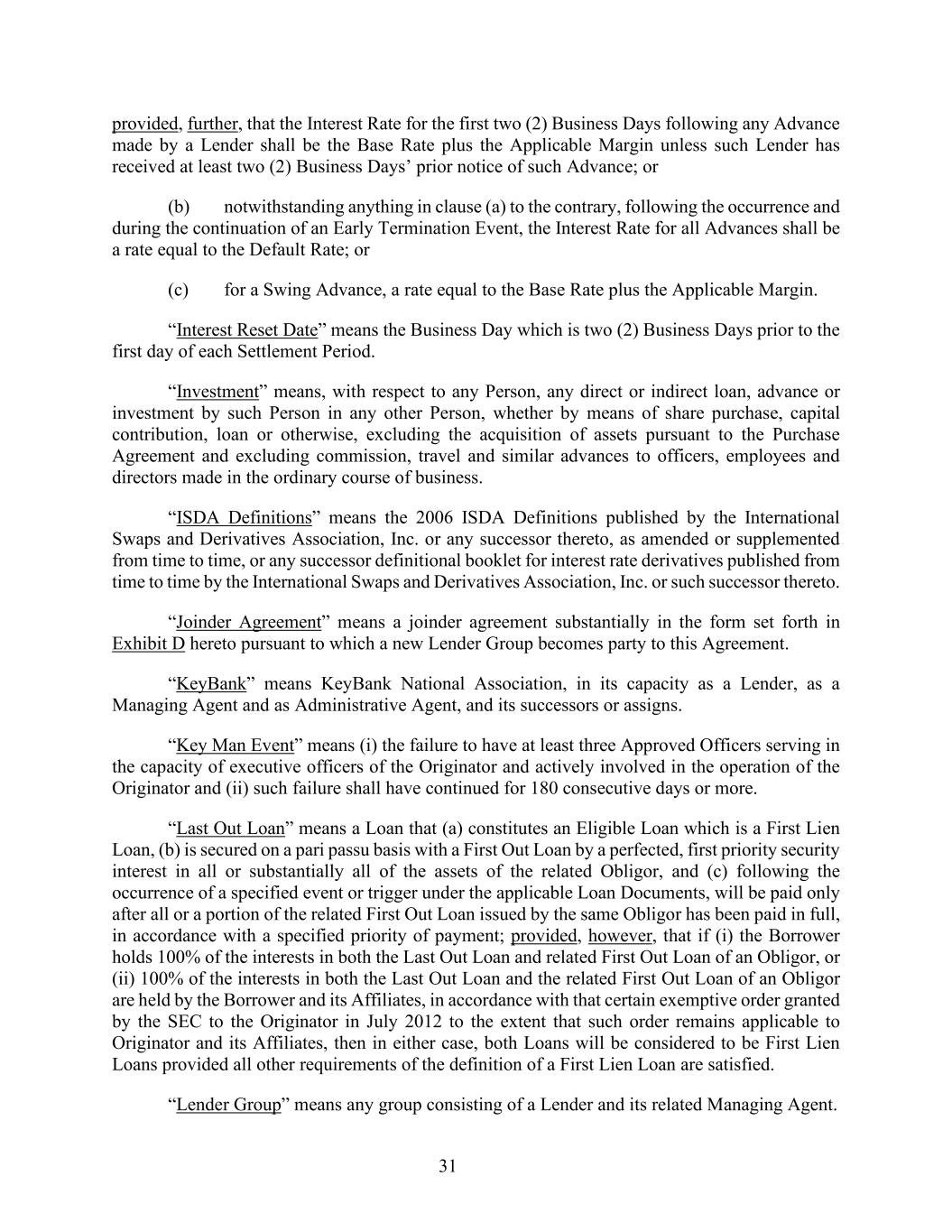 31 provided, further, that the Interest Rate for the first two (2) Business Days following any Advance made by a Lender shall be the Base Rate plus the Applicable Margin unless such Lender has received at least two (2) Business Days’ prior notice of such Advance; or (b) notwithstanding anything in clause (a) to the contrary, following the occurrence and during the continuation of an Early Termination Event, the Interest Rate for all Advances shall be a rate equal to the Default Rate; or (c) for a Swing Advance, a rate equal to the Base Rate plus the Applicable Margin. “Interest Reset Date” means the Business Day which is two (2) Business Days prior to the first day of each Settlement Period. “Investment” means, with respect to any Person, any direct or indirect loan, advance or investment by such Person in any other Person, whether by means of share purchase, capital contribution, loan or otherwise, excluding the acquisition of assets pursuant to the Purchase Agreement and excluding commission, travel and similar advances to officers, employees and directors made in the ordinary course of business. “ISDA Definitions” means the 2006 ISDA Definitions published by the International Swaps and Derivatives Association, Inc. or any successor thereto, as amended or supplemented from time to time, or any successor definitional booklet for interest rate derivatives published from time to time by the International Swaps and Derivatives Association, Inc. or such successor thereto. “Joinder Agreement” means a joinder agreement substantially in the form set forth in Exhibit D hereto pursuant to which a new Lender Group becomes party to this Agreement. “KeyBank” means KeyBank National Association, in its capacity as a Lender, as a Managing Agent and as Administrative Agent, and its successors or assigns. “Key Man Event” means (i) the failure to have at least three Approved Officers serving in the capacity of executive officers of the Originator and actively involved in the operation of the Originator and (ii) such failure shall have continued for 180 consecutive days or more. “Last Out Loan” means a Loan that (a) constitutes an Eligible Loan which is a First Lien Loan, (b) is secured on a pari passu basis with a First Out Loan by a perfected, first priority security interest in all or substantially all of the assets of the related Obligor, and (c) following the occurrence of a specified event or trigger under the applicable Loan Documents, will be paid only after all or a portion of the related First Out Loan issued by the same Obligor has been paid in full, in accordance with a specified priority of payment; provided, however, that if (i) the Borrower holds 100% of the interests in both the Last Out Loan and related First Out Loan of an Obligor, or (ii) 100% of the interests in both the Last Out Loan and the related First Out Loan of an Obligor are held by the Borrower and its Affiliates, in accordance with that certain exemptive order granted by the SEC to the Originator in July 2012 to the extent that such order remains applicable to Originator and its Affiliates, then in either case, both Loans will be considered to be First Lien Loans provided all other requirements of the definition of a First Lien Loan are satisfied. “Lender Group” means any group consisting of a Lender and its related Managing Agent.