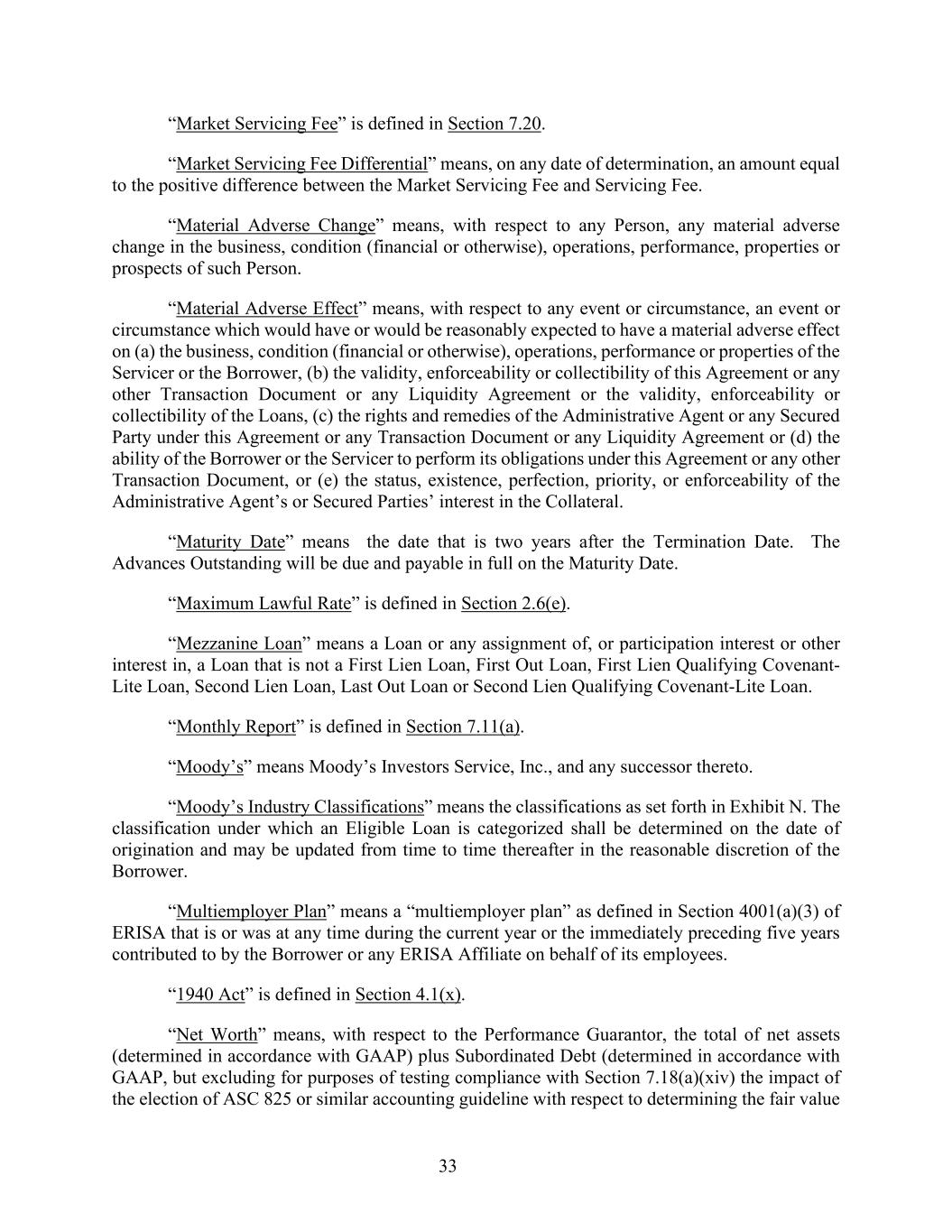 33 “Market Servicing Fee” is defined in Section 7.20. “Market Servicing Fee Differential” means, on any date of determination, an amount equal to the positive difference between the Market Servicing Fee and Servicing Fee. “Material Adverse Change” means, with respect to any Person, any material adverse change in the business, condition (financial or otherwise), operations, performance, properties or prospects of such Person. “Material Adverse Effect” means, with respect to any event or circumstance, an event or circumstance which would have or would be reasonably expected to have a material adverse effect on (a) the business, condition (financial or otherwise), operations, performance or properties of the Servicer or the Borrower, (b) the validity, enforceability or collectibility of this Agreement or any other Transaction Document or any Liquidity Agreement or the validity, enforceability or collectibility of the Loans, (c) the rights and remedies of the Administrative Agent or any Secured Party under this Agreement or any Transaction Document or any Liquidity Agreement or (d) the ability of the Borrower or the Servicer to perform its obligations under this Agreement or any other Transaction Document, or (e) the status, existence, perfection, priority, or enforceability of the Administrative Agent’s or Secured Parties’ interest in the Collateral. “Maturity Date” means the date that is two years after the Termination Date. The Advances Outstanding will be due and payable in full on the Maturity Date. “Maximum Lawful Rate” is defined in Section 2.6(e). “Mezzanine Loan” means a Loan or any assignment of, or participation interest or other interest in, a Loan that is not a First Lien Loan, First Out Loan, First Lien Qualifying Covenant- Lite Loan, Second Lien Loan, Last Out Loan or Second Lien Qualifying Covenant-Lite Loan. “Monthly Report” is defined in Section 7.11(a). “Moody’s” means Moody’s Investors Service, Inc., and any successor thereto. “Moody’s Industry Classifications” means the classifications as set forth in Exhibit N. The classification under which an Eligible Loan is categorized shall be determined on the date of origination and may be updated from time to time thereafter in the reasonable discretion of the Borrower. “Multiemployer Plan” means a “multiemployer plan” as defined in Section 4001(a)(3) of ERISA that is or was at any time during the current year or the immediately preceding five years contributed to by the Borrower or any ERISA Affiliate on behalf of its employees. “1940 Act” is defined in Section 4.1(x). “Net Worth” means, with respect to the Performance Guarantor, the total of net assets (determined in accordance with GAAP) plus Subordinated Debt (determined in accordance with GAAP, but excluding for purposes of testing compliance with Section 7.18(a)(xiv) the impact of the election of ASC 825 or similar accounting guideline with respect to determining the fair value