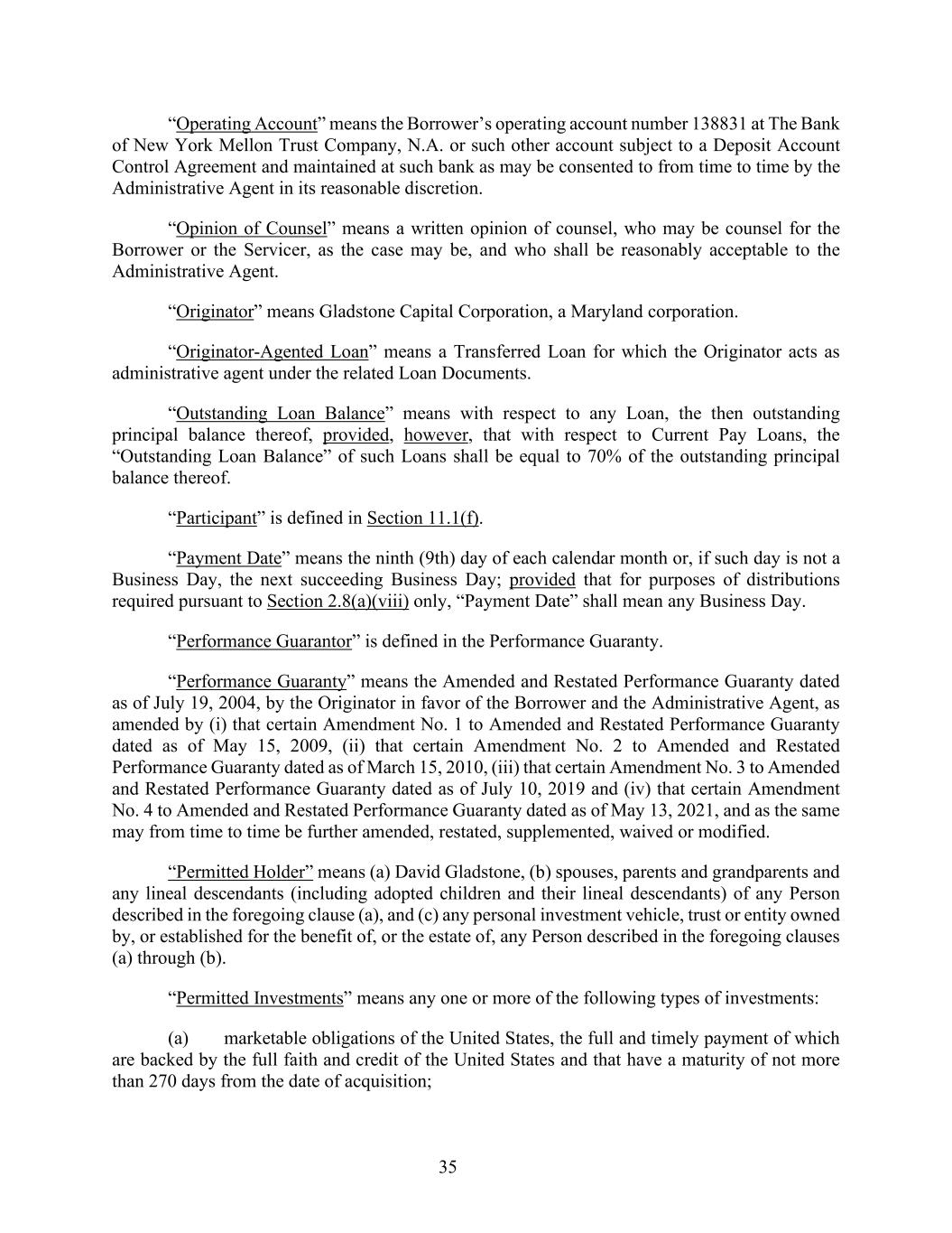 35 “Operating Account” means the Borrower’s operating account number 138831 at The Bank of New York Mellon Trust Company, N.A. or such other account subject to a Deposit Account Control Agreement and maintained at such bank as may be consented to from time to time by the Administrative Agent in its reasonable discretion. “Opinion of Counsel” means a written opinion of counsel, who may be counsel for the Borrower or the Servicer, as the case may be, and who shall be reasonably acceptable to the Administrative Agent. “Originator” means Gladstone Capital Corporation, a Maryland corporation. “Originator-Agented Loan” means a Transferred Loan for which the Originator acts as administrative agent under the related Loan Documents. “Outstanding Loan Balance” means with respect to any Loan, the then outstanding principal balance thereof, provided, however, that with respect to Current Pay Loans, the “Outstanding Loan Balance” of such Loans shall be equal to 70% of the outstanding principal balance thereof. “Participant” is defined in Section 11.1(f). “Payment Date” means the ninth (9th) day of each calendar month or, if such day is not a Business Day, the next succeeding Business Day; provided that for purposes of distributions required pursuant to Section 2.8(a)(viii) only, “Payment Date” shall mean any Business Day. “Performance Guarantor” is defined in the Performance Guaranty. “Performance Guaranty” means the Amended and Restated Performance Guaranty dated as of July 19, 2004, by the Originator in favor of the Borrower and the Administrative Agent, as amended by (i) that certain Amendment No. 1 to Amended and Restated Performance Guaranty dated as of May 15, 2009, (ii) that certain Amendment No. 2 to Amended and Restated Performance Guaranty dated as of March 15, 2010, (iii) that certain Amendment No. 3 to Amended and Restated Performance Guaranty dated as of July 10, 2019 and (iv) that certain Amendment No. 4 to Amended and Restated Performance Guaranty dated as of May 13, 2021, and as the same may from time to time be further amended, restated, supplemented, waived or modified. “Permitted Holder” means (a) David Gladstone, (b) spouses, parents and grandparents and any lineal descendants (including adopted children and their lineal descendants) of any Person described in the foregoing clause (a), and (c) any personal investment vehicle, trust or entity owned by, or established for the benefit of, or the estate of, any Person described in the foregoing clauses (a) through (b). “Permitted Investments” means any one or more of the following types of investments: (a) marketable obligations of the United States, the full and timely payment of which are backed by the full faith and credit of the United States and that have a maturity of not more than 270 days from the date of acquisition;
